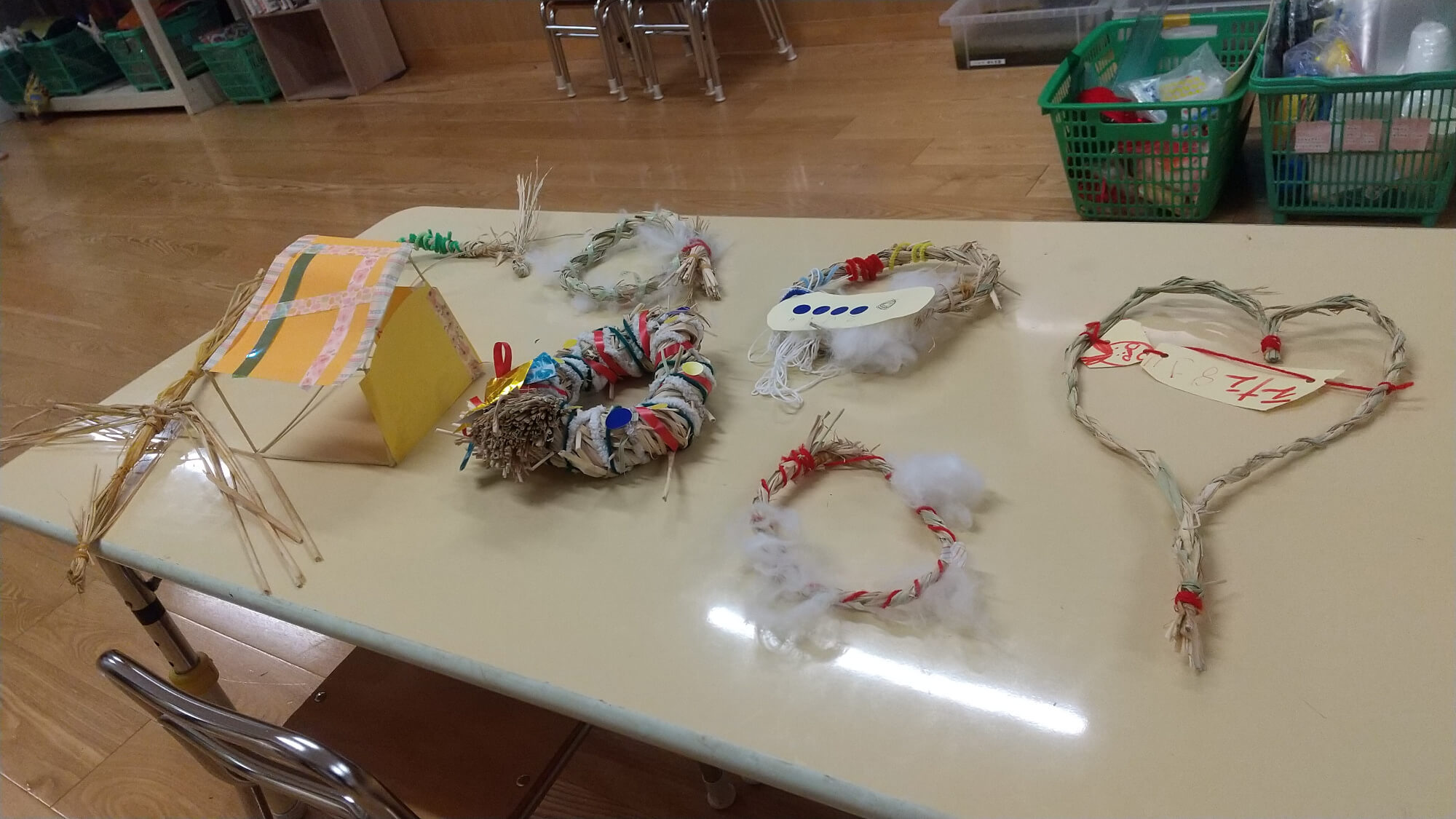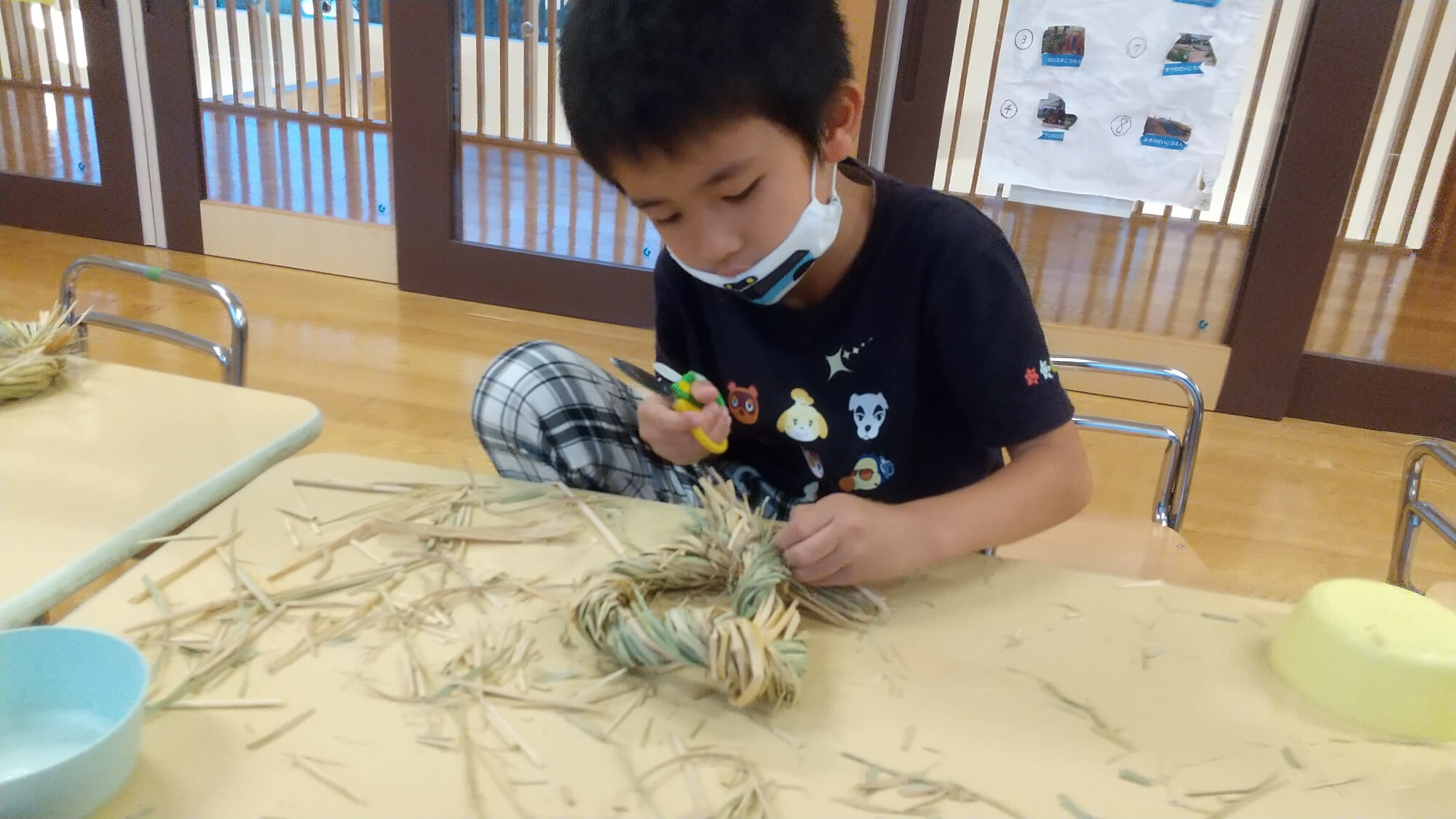 柔らかくなった藁は、思い思いの形に加工します。リースの形にしようと輪ゴムで結ったり紐でくくったり、指先を使いながらの作業です。なかなか上手にできないときは、「先生手伝って」と、助けを呼びながらもやり遂げる姿がありました。
