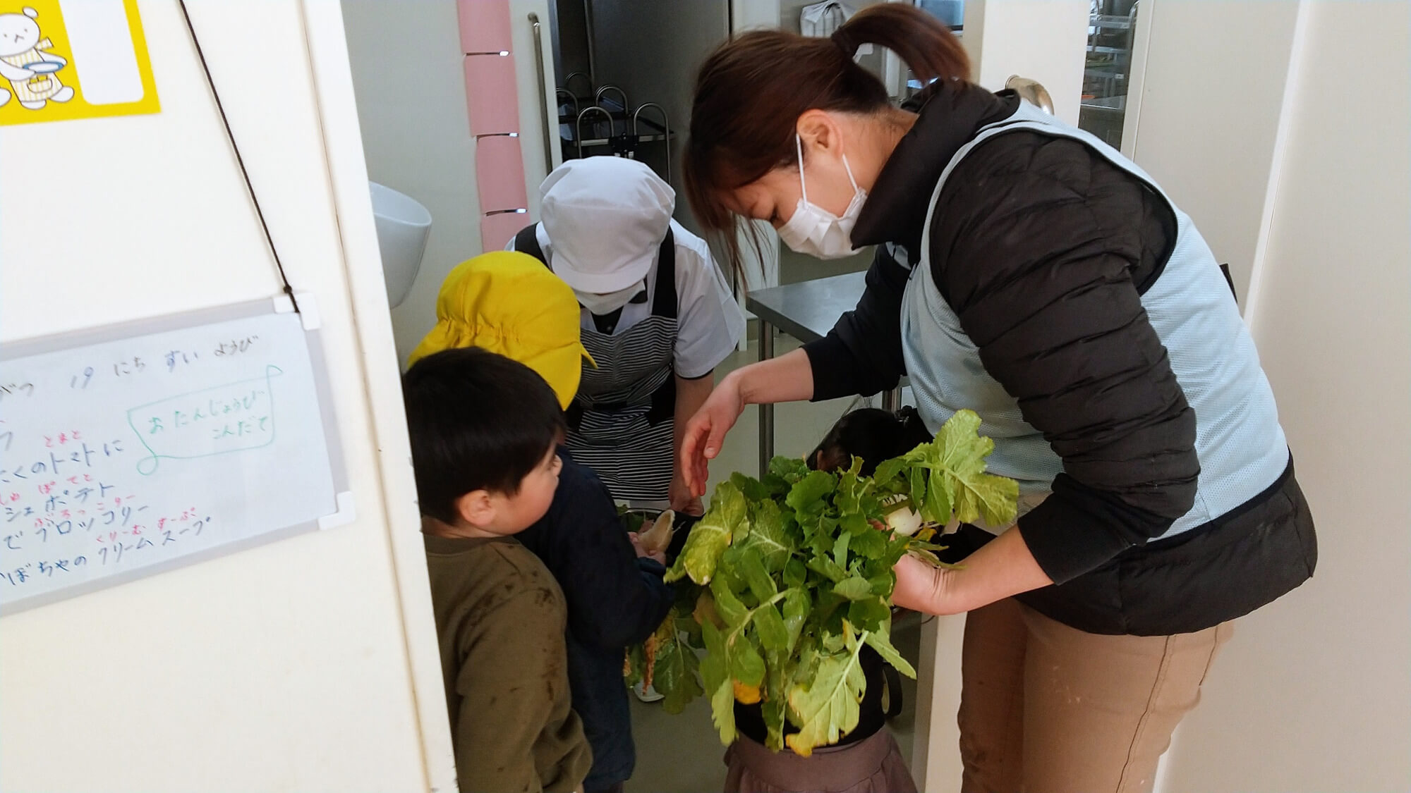 畑では冬野菜の大根が大きくなり、子どもたちと収穫に行きました。大きな大根を抜こうとしても根が張っており、なかなか一人では抜けません。「誰か手伝ってー」と友達に声をかけると「どうしたどうした」と集まり、協力し合って大根抜き大会の始まりです。大根を引っ張る子、その友達を引っ張る子…とまさに絵本さながらの姿が見られました。