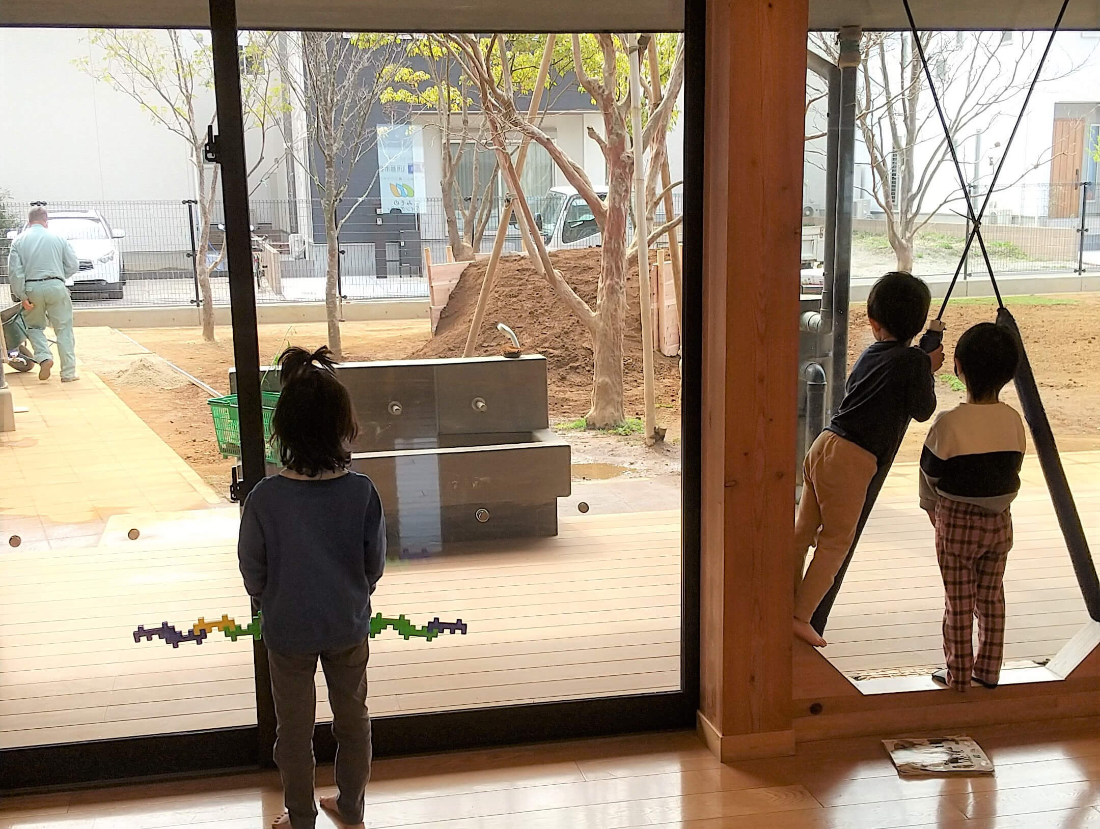 園庭を工事しているショベルカーなどを室内から見ていた子どもたちの背中からはワクワクが溢れていました。