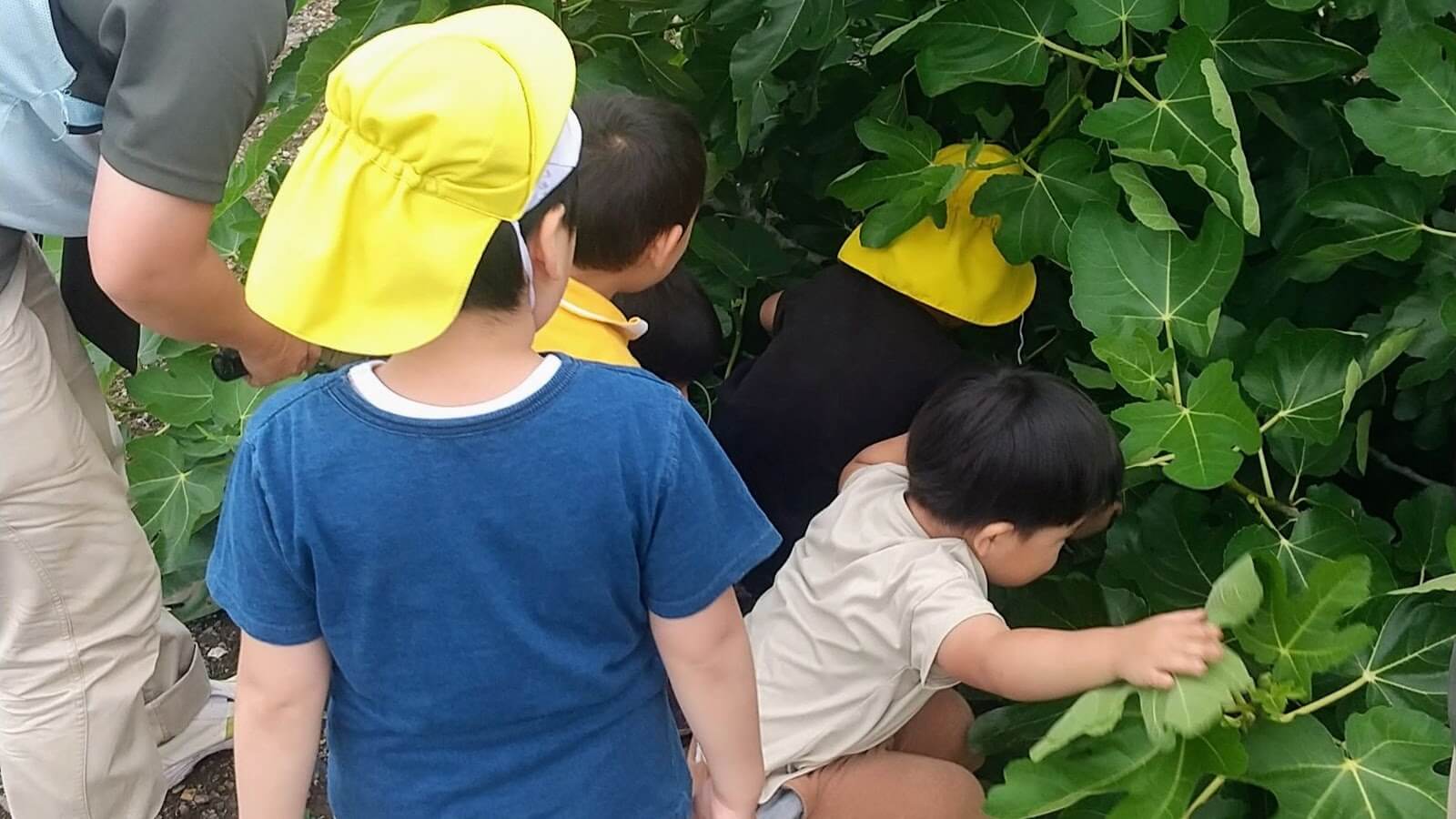畑にあるイチジクの木を見つけ、覗いてみる子どもたち。職員の服に尺取虫が付いてるのを見つけると「園庭で観察しよう」と声が上がったため、園庭に連れて帰り観察をしました。