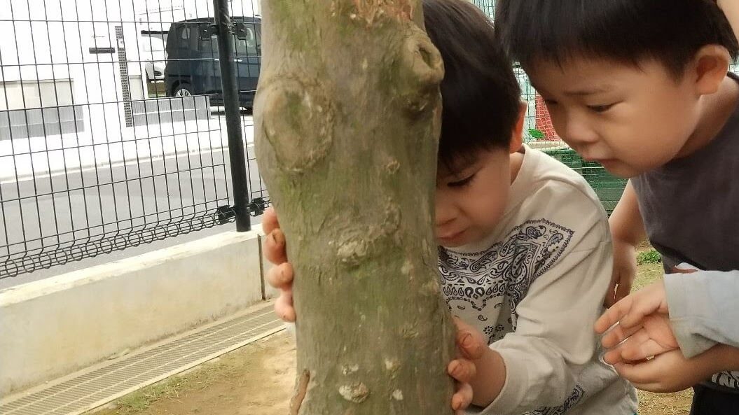 イチジクの木で見つけた虫について、「ここの木の穴を家にしよう」や「土が必要だよ」などのやり取りを楽しみました。また、順番を決めて譲り合いながら、虫と触れ合う様子も見られました。 4月から変わった環境にも慣れ始め、子ども同士の関わりが多く見られるようになっています。