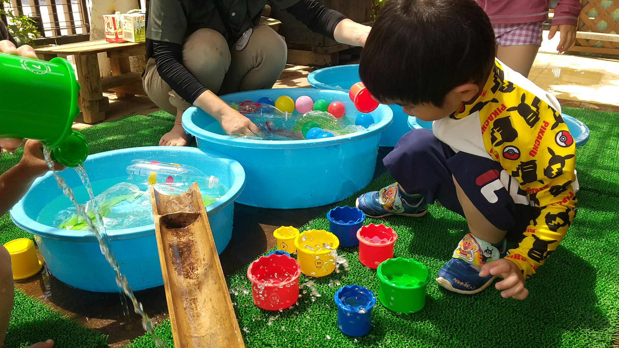 タライに溜めた水を使って、じょうろ遊びや、カップ遊び、職員と一緒に流しそうめんのようにボールを転がして遊ぶなど、いろいろ工夫して遊びを展開しています。