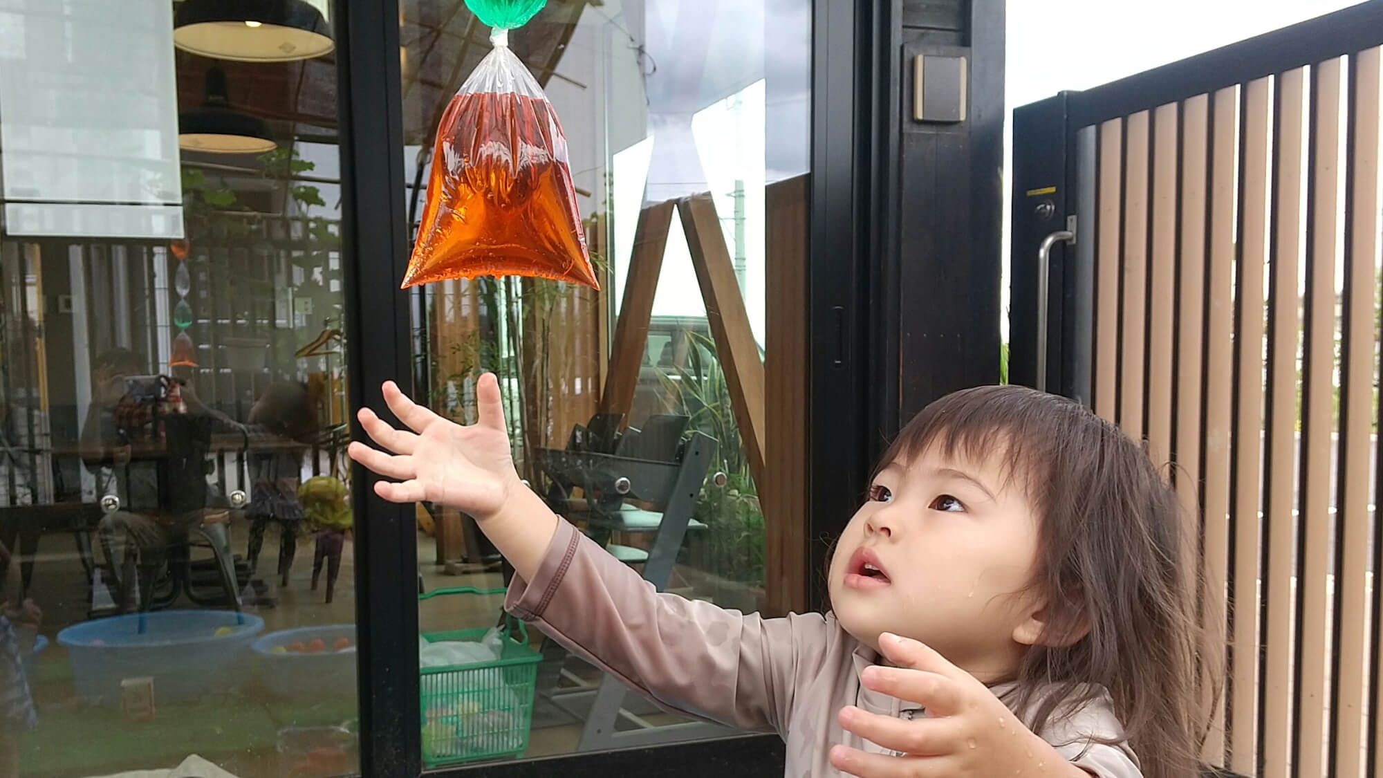 水遊びもさまざまな仕掛けをしています。上から色水を入れた傘袋を吊るしてみると光に当たってキラキラと光って子どもたちは興味津々に見上げています。手を伸ばしたり揉んでみたり、目や手を使ったりして、柔らかい感触や冷たい感触などさまざまな感触を直接肌で感じることを楽しんでいます。