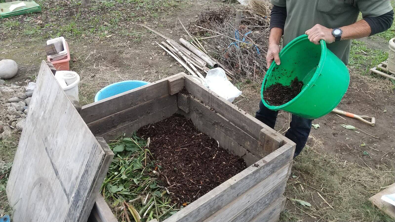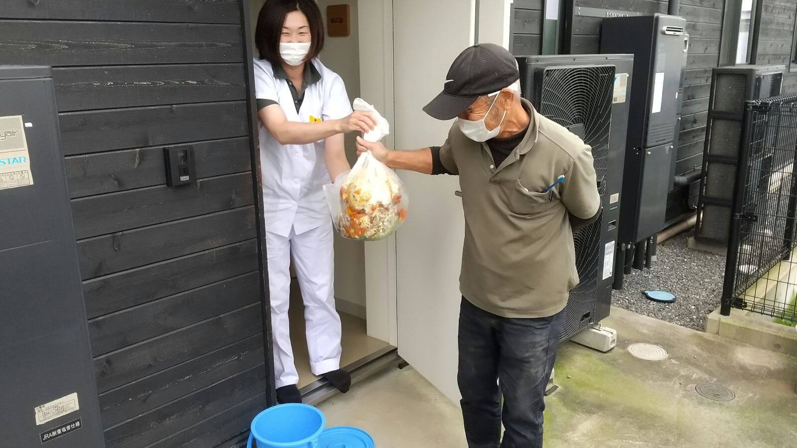残食は給食室からスタッフへ渡され畑の一角に作った手作り肥料箱に入れられます。