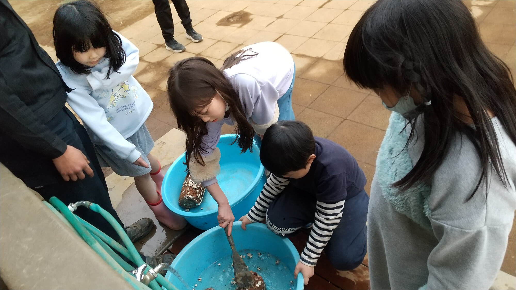 子どもたちの前にシイタケの原木を出すと、みんな目を輝かせ、興味津々で近づいてきます。潰れているシイタケを取り除く工程の際には、「とてもくさいよ!」「小さいキノコがいっぱいある!」と、シイタケを観察しながら五感で感じ取っている様子が見られました。