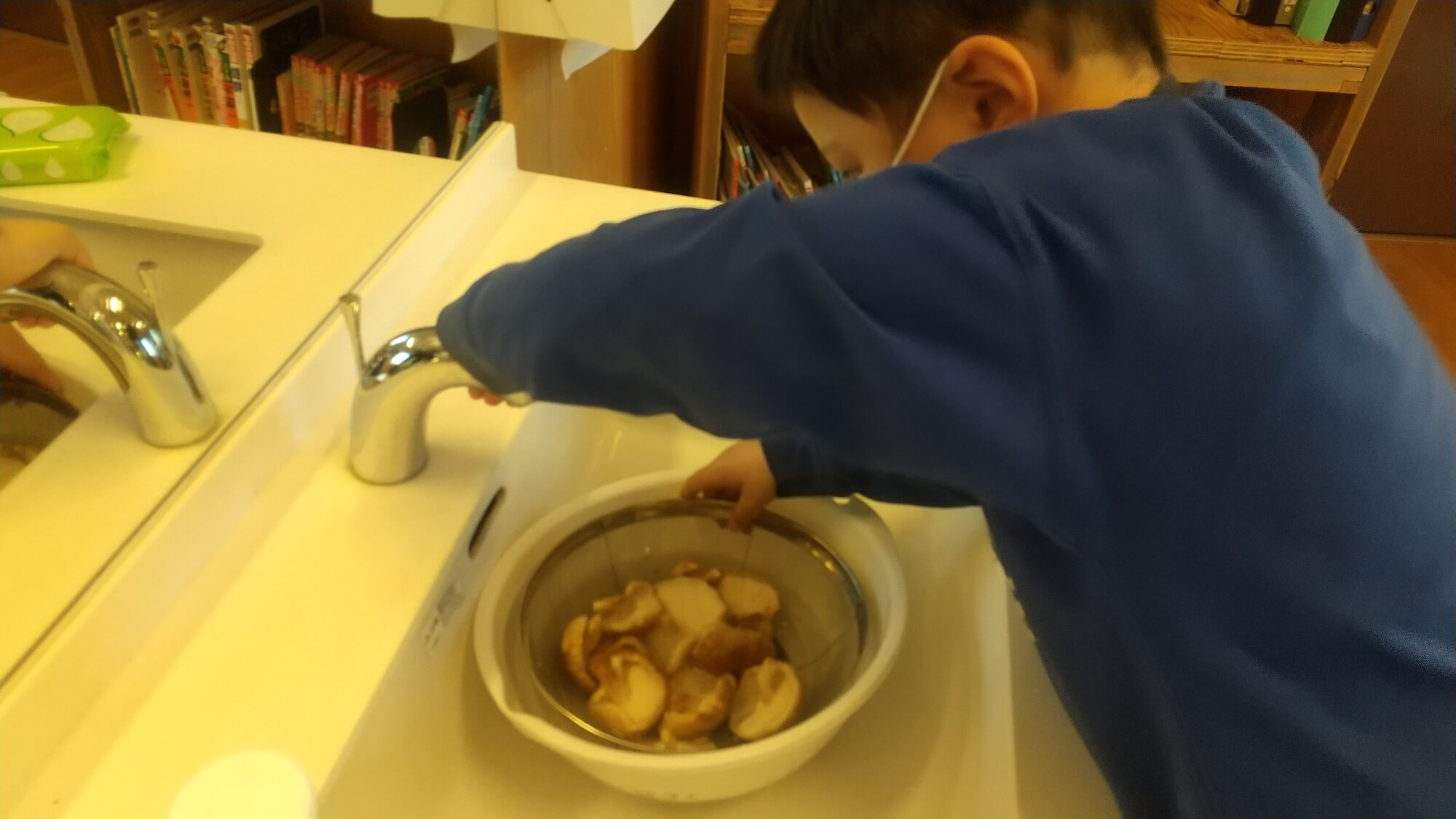 収穫した後は、丁寧にハサミで切り取ったシイタケを水洗いし、加熱をしていきます。4月から継続して畑での収穫物を調理してきたこともあり、子どもたちも慣れた様子で調理に参加していました。