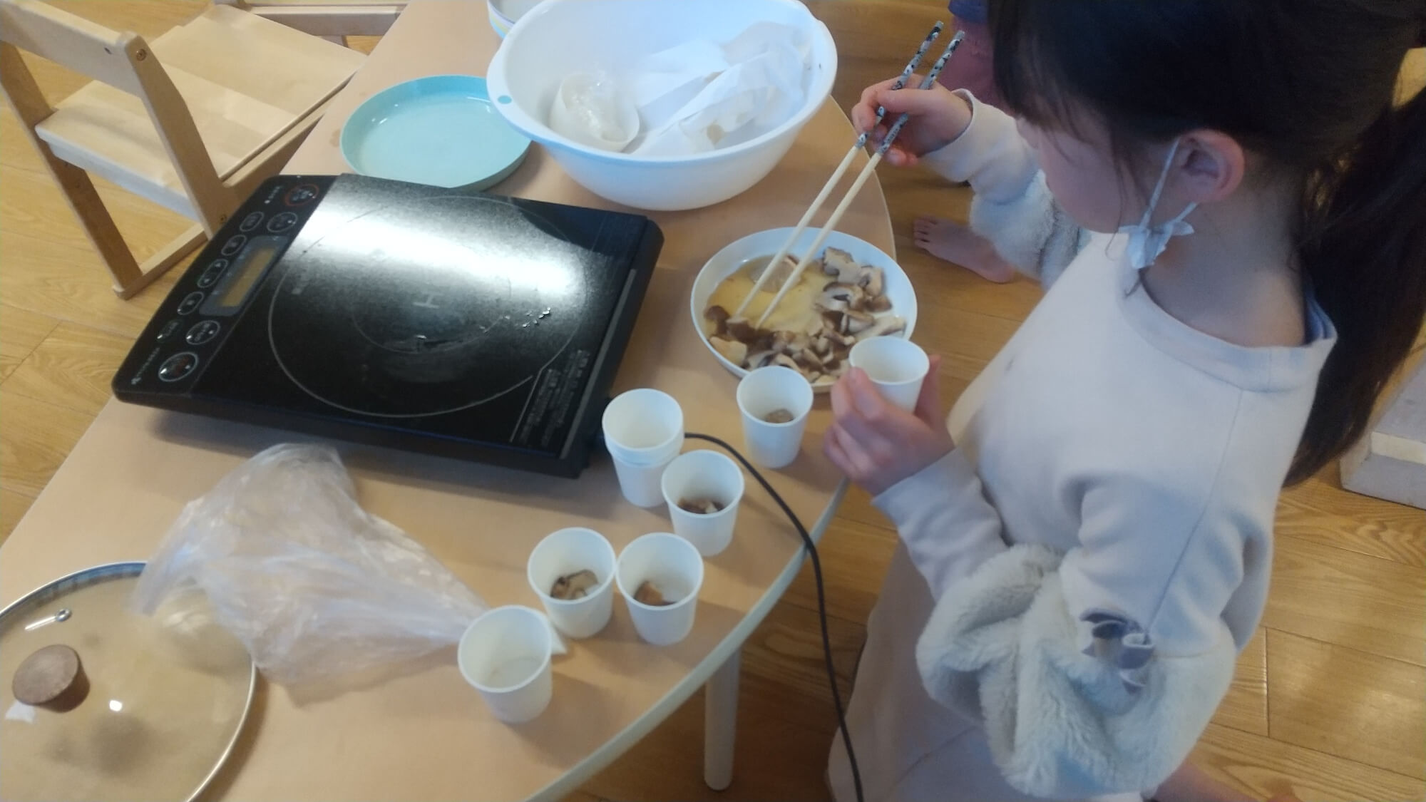 役割分担も水洗い担当、味付け担当等、自分たちで考えながら決めており、主体的に行動する姿が見られるようになっています。さらに、出来上がったシイタケを食べる際は「先生たちにもあげよう!」と、一つひとつ小分けにし、職員に配る姿も見られ、活動を通して様々な感情が豊かに育まれていることが見えてきます。