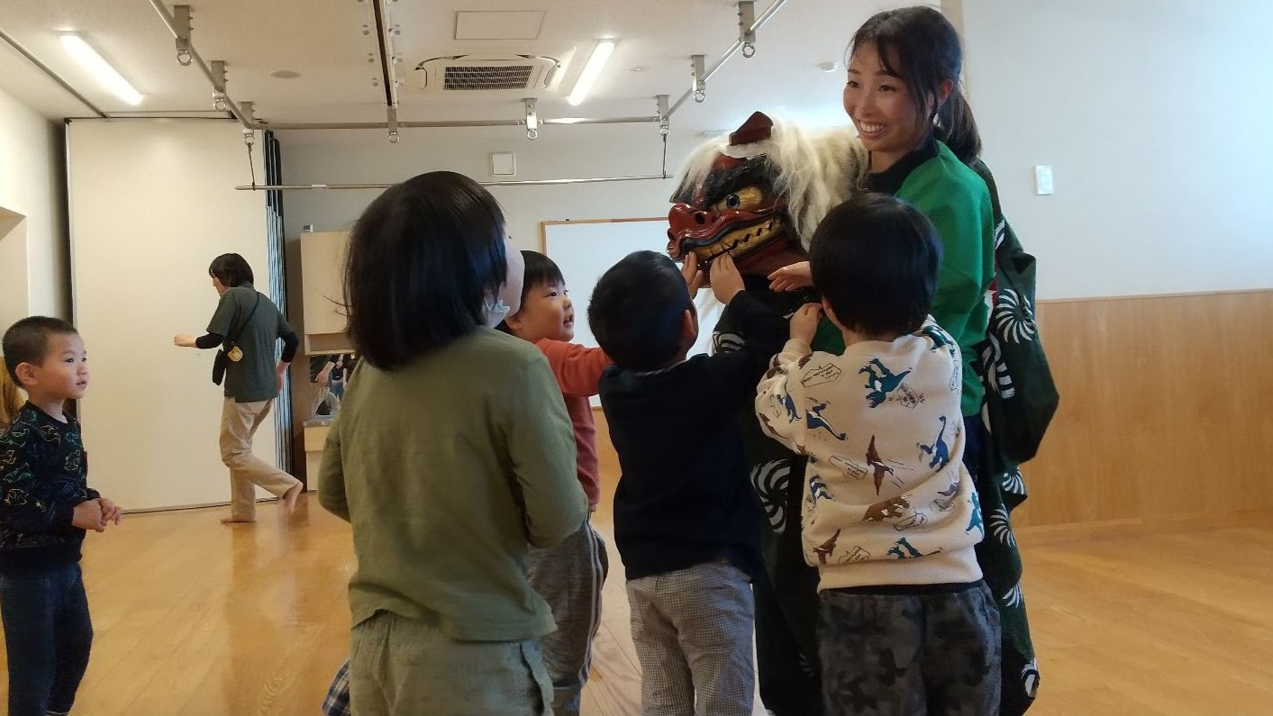 獅子舞が登場すると、一目散に部屋から出ていこうとする子もいれば、興味津々で獅子舞の動きを食い入るように観察する子もいました。