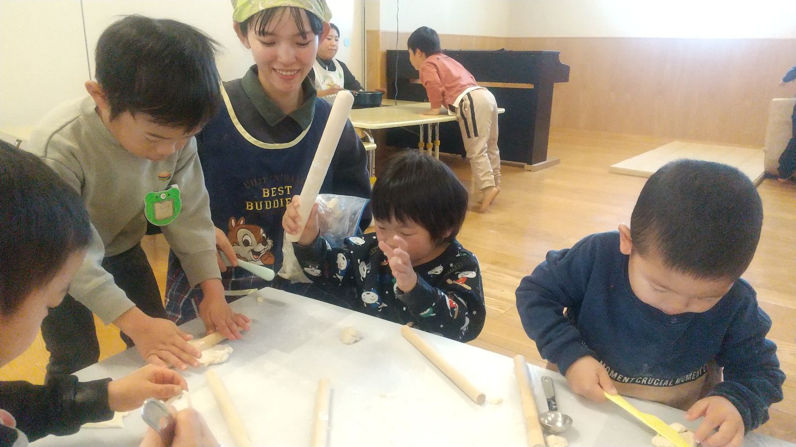 その生地をめん棒で伸ばし、へらを使って切りました。普段の活動の中で行っている粘土遊びの要領で、めん棒を使い生地を大きく薄く伸ばすことができました。