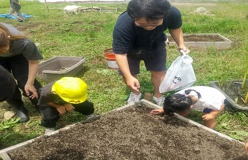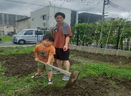 次に、小石拾いや畝づくりも行いました。畝づくりでは、子どもも保護者の方も鍬を力強く振るう姿が見られました。土を掘り起こすことはかなりの力が必要ですが、力を合わせて畑の土を耕しました。