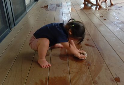 園庭では、山づくりや、縁側の雑巾がけ、窓ふきを行いました。縁側や窓には色とりどりの手形があり、「みんなで手形をきれいにしよう」と声を掛けると、年長児から2歳児まで、みんなで一生懸命雑巾がけをしました。友だち同士で「ここにもあった」「たくさん消したよ」と声を掛け合いながら、雑巾がけに取り組んでいました。雑巾絞りが苦手なお子さんたちは、スポンジを選択しました。力を入れてスポンジを絞ることができ、意欲的に取り組んでいました。