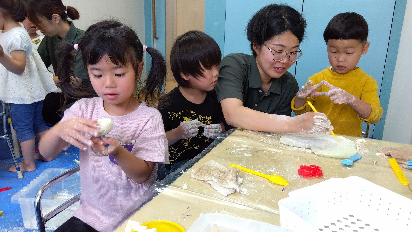 梅雨の雨の日には、室内で小麦粉粘土を実施しました。小麦粉が手からさらさら落ちていく触感を感じた後、粉に少しずつ水をいれていき粘り気を出しました。その変化に気づき、粉がまとまっていく変化を面白く感じる子もいれば、水を入れすぎて形にできずに試行錯誤する子もいました。