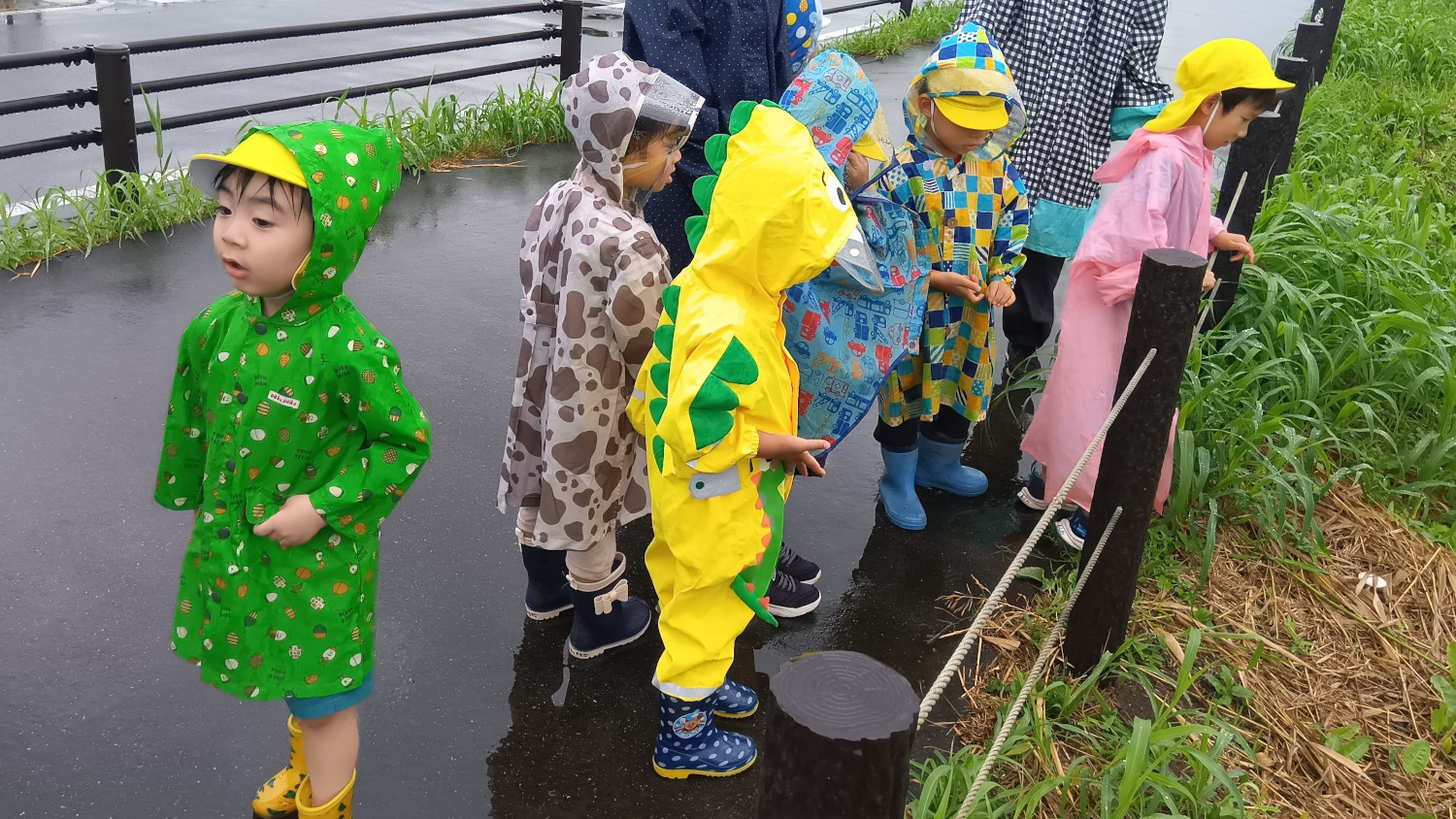 また別の日には、小雨の中でも園庭に出たいという子どもたちの発信で、カッパを着て園庭で過ごす日もありました。さらに、「雨の日散歩」という名目で、カッパを着て園の周辺を散歩しました。葉っぱに落ちる雨音に気づき、「雨の音がする」と雨ならではの発見がありました。雨の日も、戸外で子どもたちの声が響き渡っています。