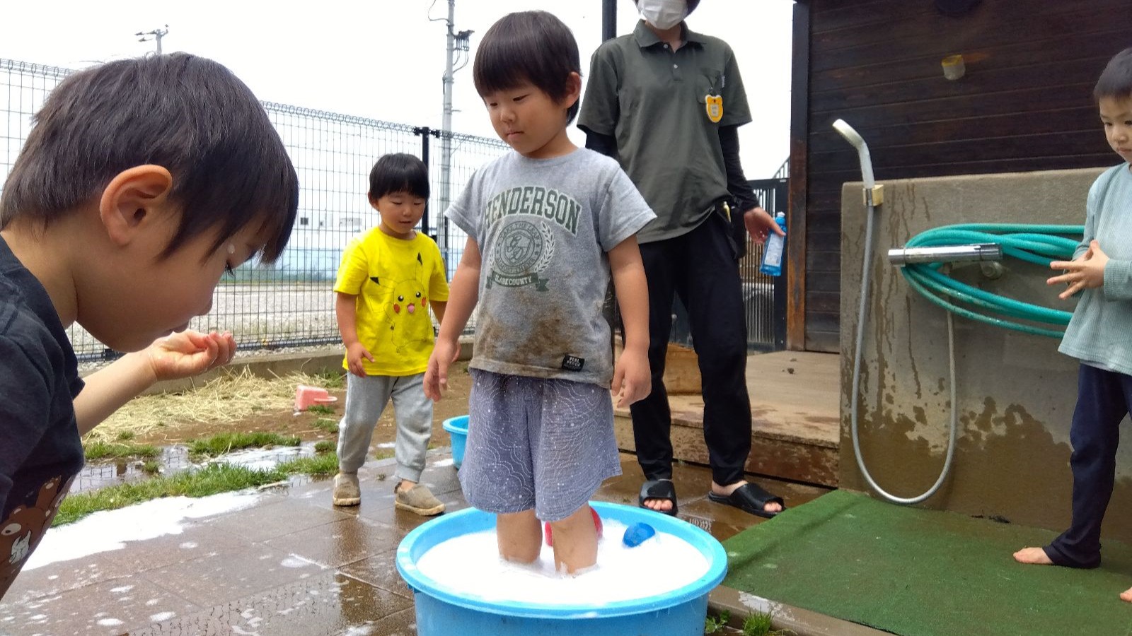 最近は、水遊びがさらに発展して、泡遊びを実施しています。水に固形石鹸をいれて、かき混ぜるとどんどん泡が立っていきます。その不思議さに気づいて、手や足や顔に泡をつけて全身で感触を楽しむ姿がありました。泡をたくさん作って、友だち同士で協力して泡の川を作る遊びに発展していきました。