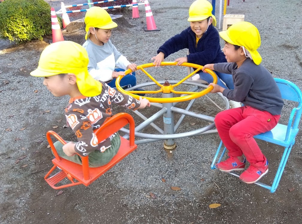 焚き火をするにあたって、必要な材料を集めるために、散歩の行き先は枝がたくさん落ちている公園に決めました。少し長い距離を歩き、まずは椅子のついた回転遊具を楽しんだり、追いかけっこをしたり、たくさん体を動かしました。