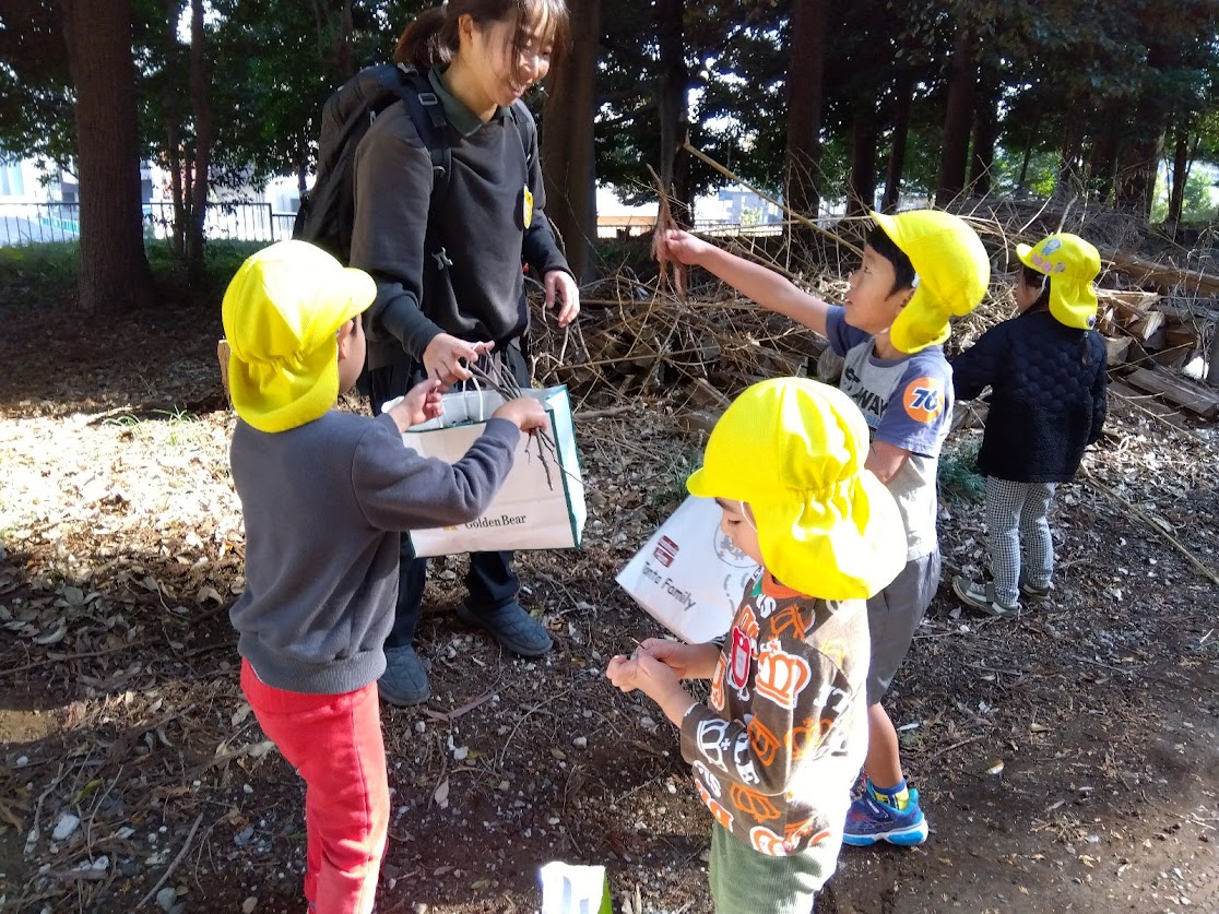 焚き火の材料集めをするために来たことを思い出して「スギの葉っぱを集めてね」と写真を見せると、紙袋いっぱいにスギの葉を集めてくれました。次は枝集めを提案すると、長い枝を見つけてきてくれました。「こうやって折ったらちょうどいい長さになるね」と話していると、友だち同士で協力して枝を折る姿も見られました。