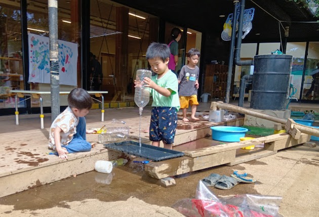 その様子に気づいた2歳児も一緒にペットボトルに水を入れて運び、上から流す遊びに発展しました。これまで自分のペースで自分の世界観で遊ぶことが多かったのですが、他児の遊びに気づき、真似をして同じ遊びを共有できた場面でした。