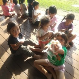 炊き立てのお米をその場で握ってもらい、給食はおにぎりにして食べました。手間暇かけて炊いたご飯は一段と美味しかったようで、おかわりをする子どもがたくさんおり、「おっきいのがいい!」「2つちょうだい!」という声も聞こえてきました。