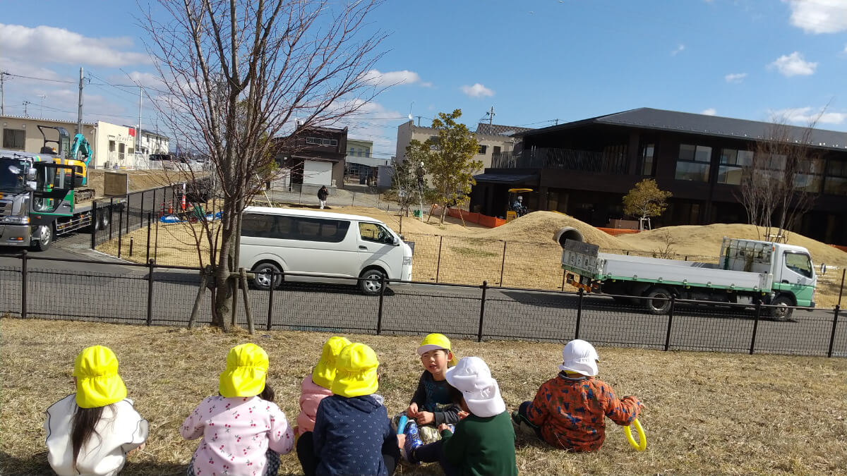 今、八山田どろんこ保育園・発達支援つむぎ 八山田ルームの子どもたちが大好きな園庭に、なんとパワーショベルやトラック等の重機が入っています。大きな築山がどんどん削れていき、子どもたちも間近に見る本物の重機の迫力に目が離せない様子です。散歩の際には保育園の隣にある広場から工事の様子を見て、「園庭どうなるのかな」「すごいね」等と子ども同士で話し合っています。