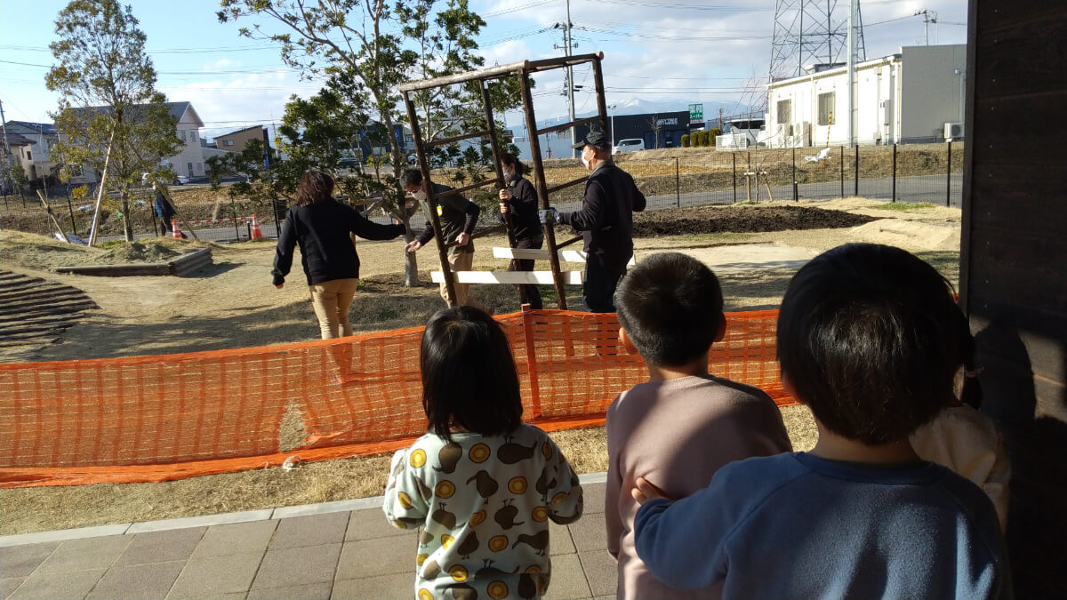 今度は、何やら大きな棚のような、トンネルのようなものが運ばれています。子どもたちも「見て!」「あれ何?」と興味津々です。新しい園庭は3月末には完成する予定です。4月から、素敵な園庭で子どもたちと一緒に豊かな経験ができることを職員たちも大変楽しみにしております。
