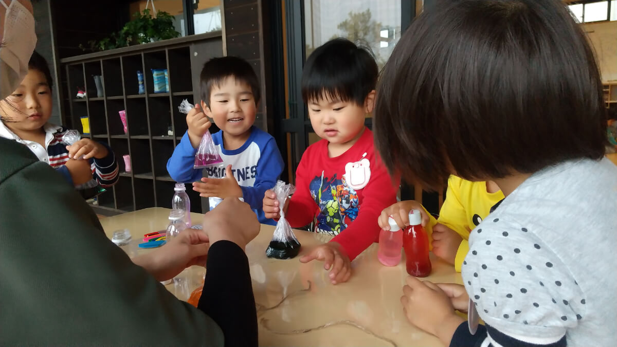 色水が入ったビニールに霧吹きで水を吹きかけその水がキラキラ光る様子を満足げに眺めている子の姿も見られました。