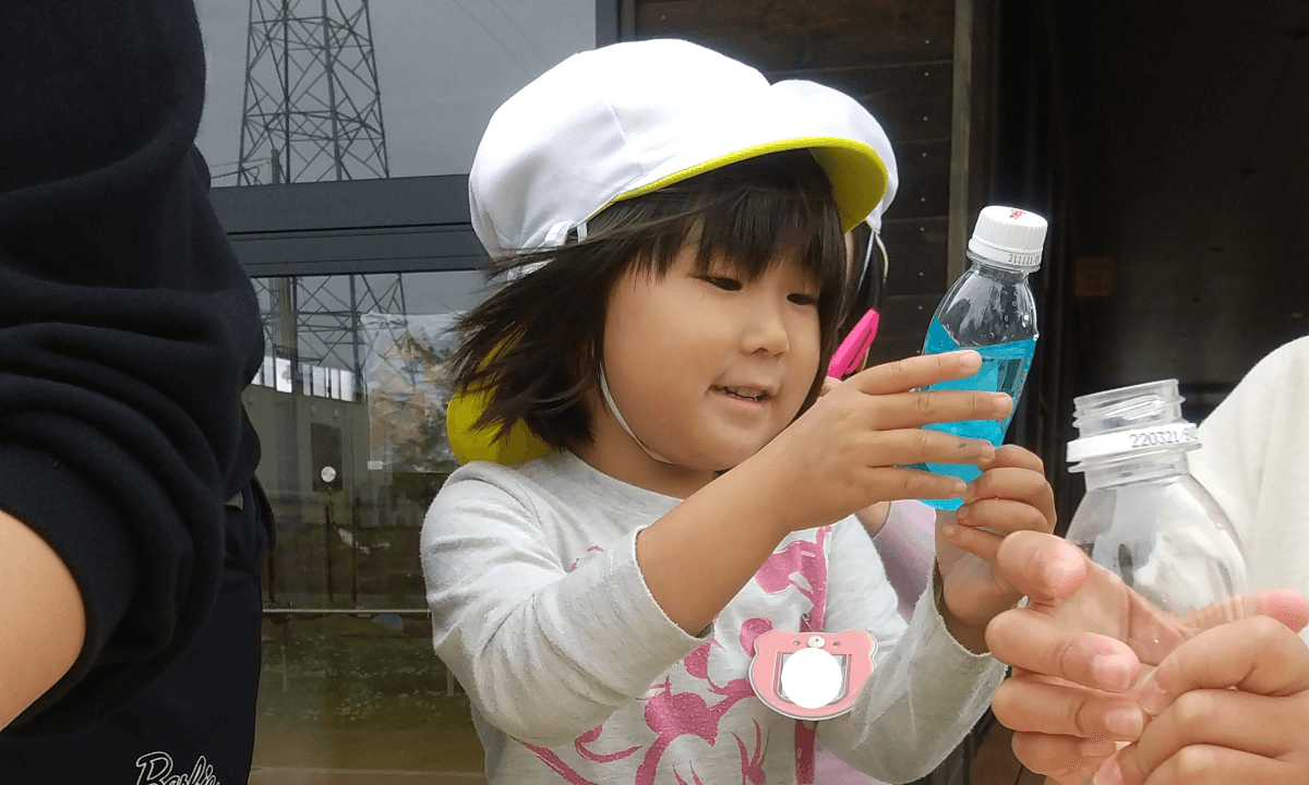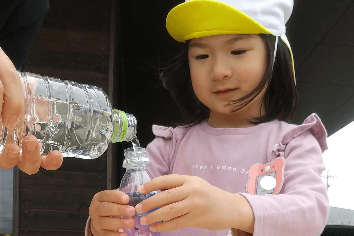 前日も参加した作り方の手順を覚え、自分ひとりで色水を作ると「できた!」と嬉しそうに勢いよくみんなに見せに行きました。