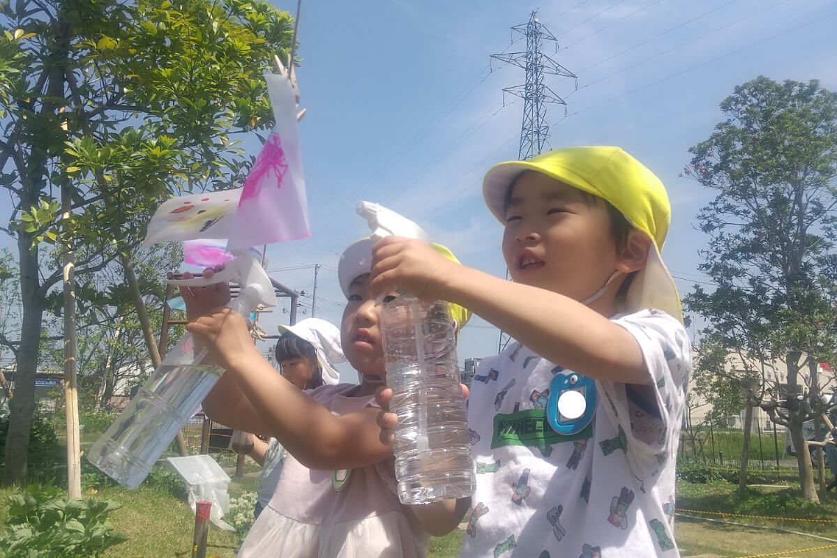 色水作りでは、水性ペンで着色した障子紙を入れた容器に水が注がれだすと「こぼさないように」「水の色が変わった?」と真剣な表情から驚いた顔、笑顔、不思議そうな顔へと様々な表情へ変わりました。