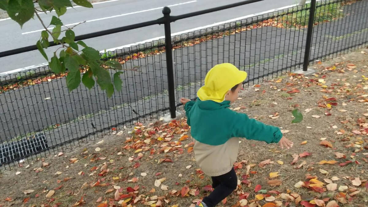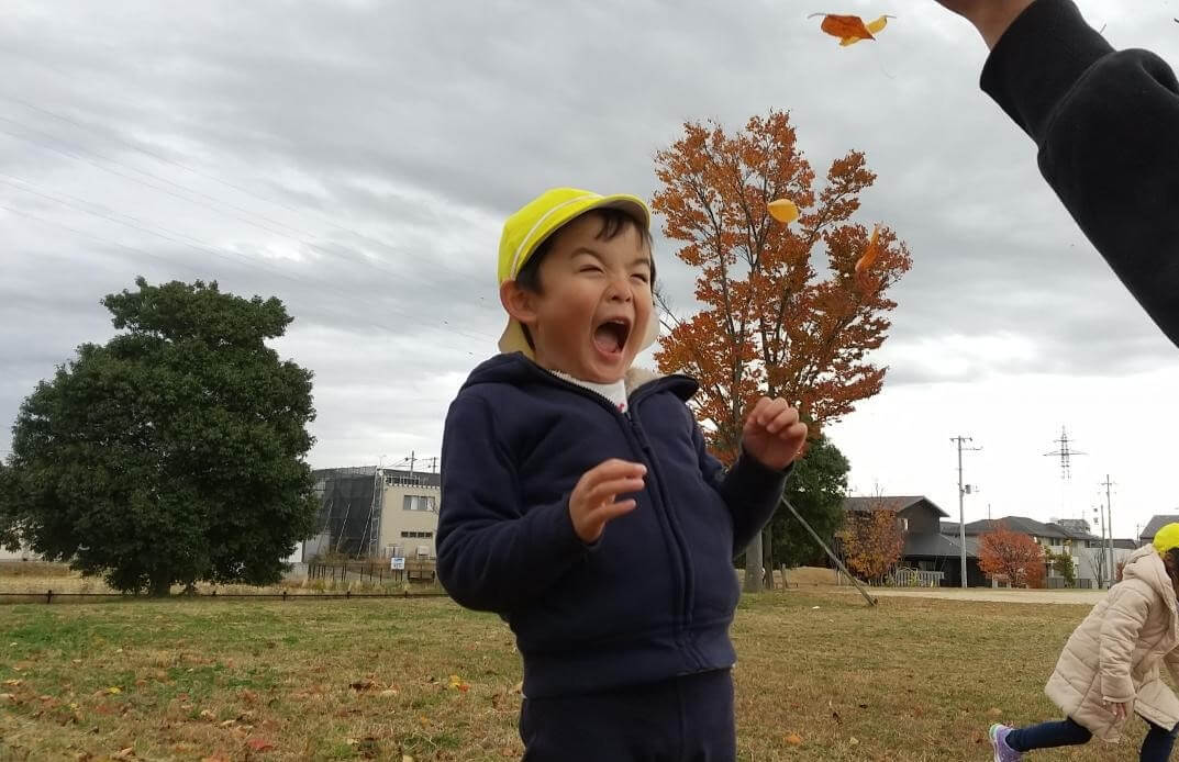 子どもたちが、あちらこちらから集めた落ち葉を職員が一気に上に投げると急に降ってきた落ち葉に驚く子どもたちもいましが、慣れてくると落ち葉が降ってくるたびに満面の笑みで喜び「もう一回!」と落ち葉を繰り返し集めていました。また子どもたちも職員の真似をして落ち葉を上に舞い上げ楽しんでいました。