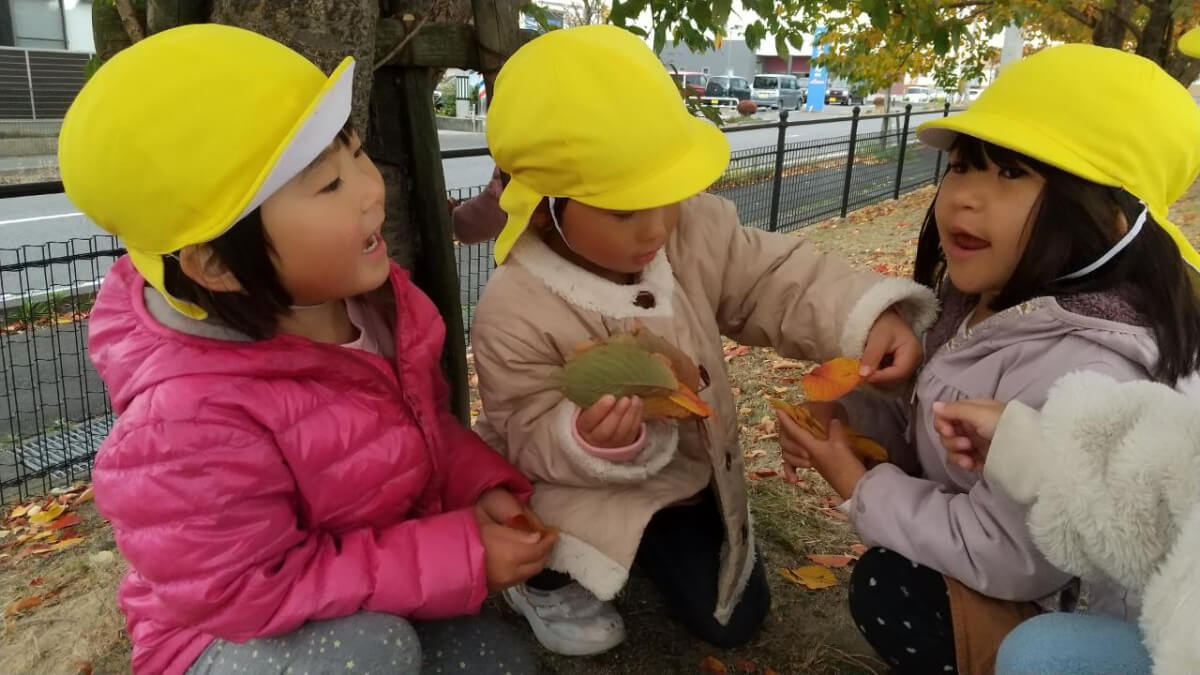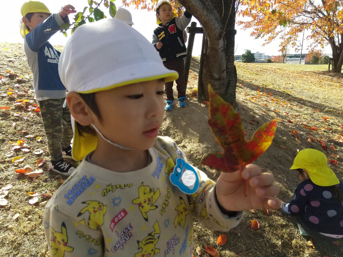自分が発見した落ち葉を友だちやスタッフと見せ合いながら、「この形見て!」「赤いね」「これは黄色いよ」「大きい」「変な匂いがする」など、落ち葉にも様々な形や色、大きさや匂いがあることを感じとり、伝えあっていました。