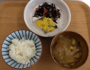 今回は、子どもたちに人気のメニューの一つを紹介します。「さわらのカレーマヨ焼き、ひじき煮、さつまいものみそ汁、ごはん」です。