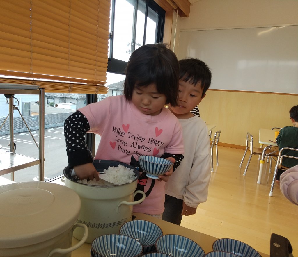 保育園の給食は、子どもたちの成長を支える、一日三回の食事のうちの大事な一食です。子どもたちの健康な身体を作るために、管理栄養士のスタッフが栄養バランスのよいおいしい献立を考えています。子どもたちは皆、保育園の給食が大好き。雑巾がけやリズム体操、畑仕事等の日課が終わると、朝9時には散歩に出発して、広場でめいっぱい体を動かして遊びます。遊び疲れて帰ってくると、自然とお腹がすいてきて「今日の給食は何~?」と興味津々で調理室をのぞきます。調理室の大きい窓からは、おいしそうなにおいがしてきて、「今日は唐揚げだ!」「人参あるね」など自然と子どもたち同士の会話もはずみます。