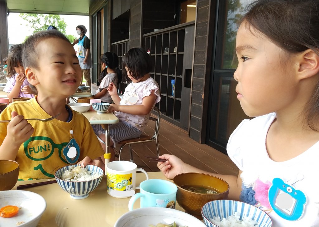 また、冬の寒さで甘味が増したさつまいもや大根を食べたり、夏の時期は畑で収穫した茄子やキュウリ等の野菜を食べたり、縁側で食べることで季節によって変わる風景を楽しんだりと、給食を通して季節を感じることができます。