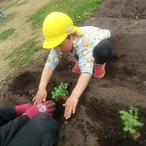 そして畑仕事にも力が入る子どもたちです。今年度1番目はさやえんどうの苗を植えました。植え方を用務の職員から真剣に話を聞き、疑問に思ったことも繰り返し聞きながら、ふかふかの土の布団に植え始めます。植える場所や感覚を考えながら一つ一つ丁寧に植えていくことで最適な感覚ですべて植えることができました。
