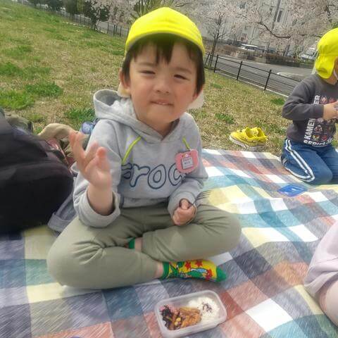 春の花が綺麗だったので、この日はお弁当を用意して桜の木の下で食べました。満開の桜の中で食べるお弁当は格別で「さくらきれいだね」「はながたくさんあるね」など大人顔負けの会話をしながら食べていました。その後も遊びの話や好きなものの話で大盛り上がり、お弁当を食べ終わるまで子どもたちの会話も花が咲いていました。