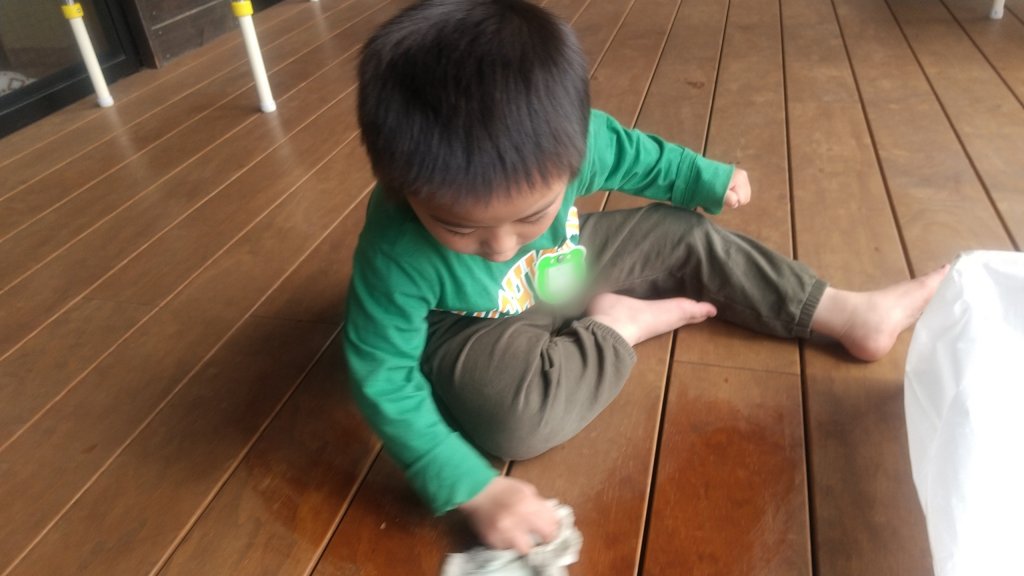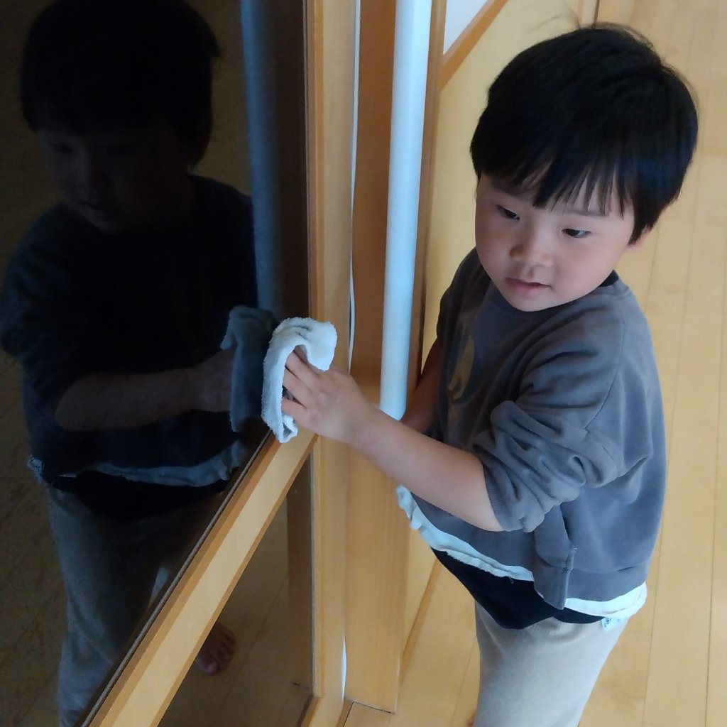 雑巾がけが終わると窓のところへ行き、「おそうじ」と言って窓の掃除を始めていました。雑巾がけは床だけでなく、掃除するものという認識があり自分で掃除を始める姿がありました。