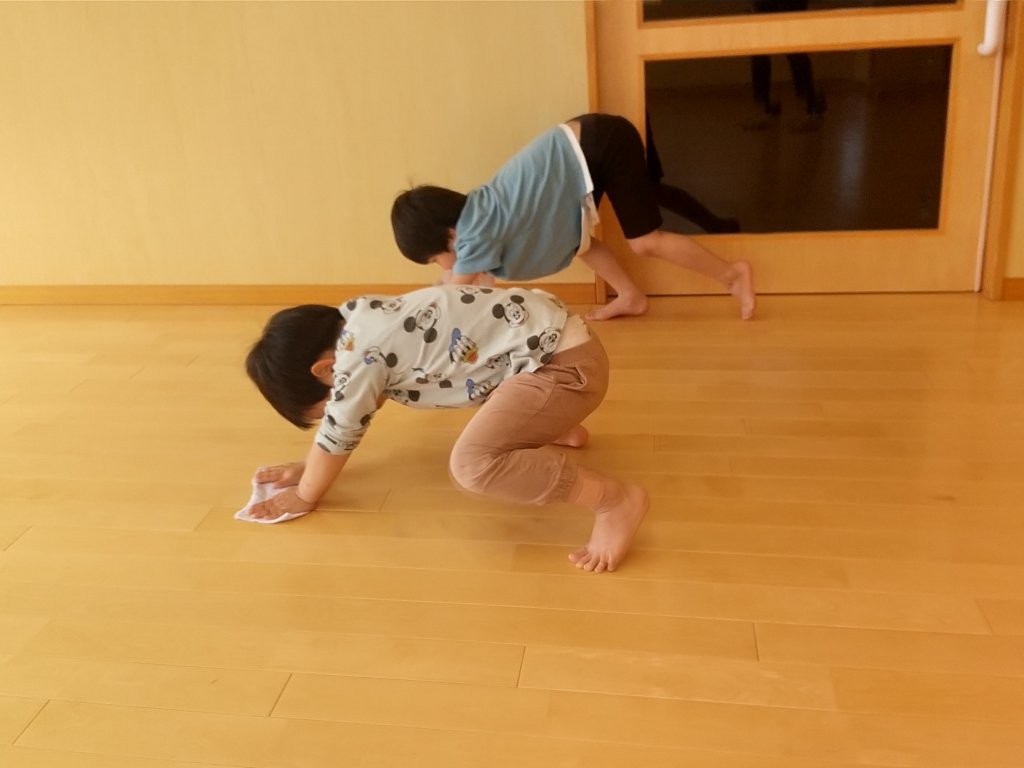 今回は日課の中の雑巾がけの様子を紹介します。雑巾がけは、四つ這いになり手足で自分の身体を支えながら行うことで、転んでも自分の身体を支えることができる力を身につけることにつながります。手足の力を調整しながら、バランスをとり前に進む雑巾がけは全身運動になります。
