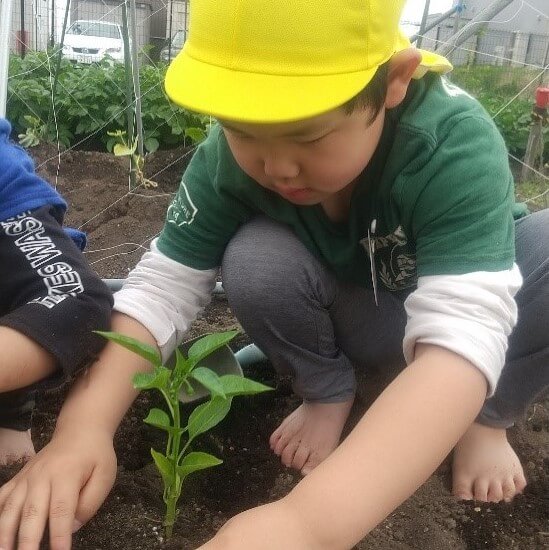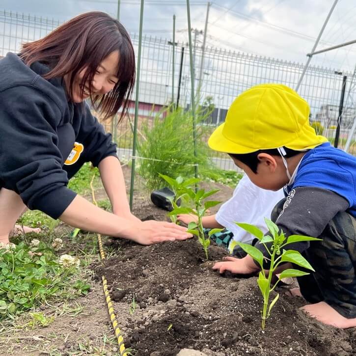八山田どろんこ保育園では毎日の日課を大切にしています。発達支援つむぎを利用している子も保育園児に混ざり日課である畑仕事を行っています。
