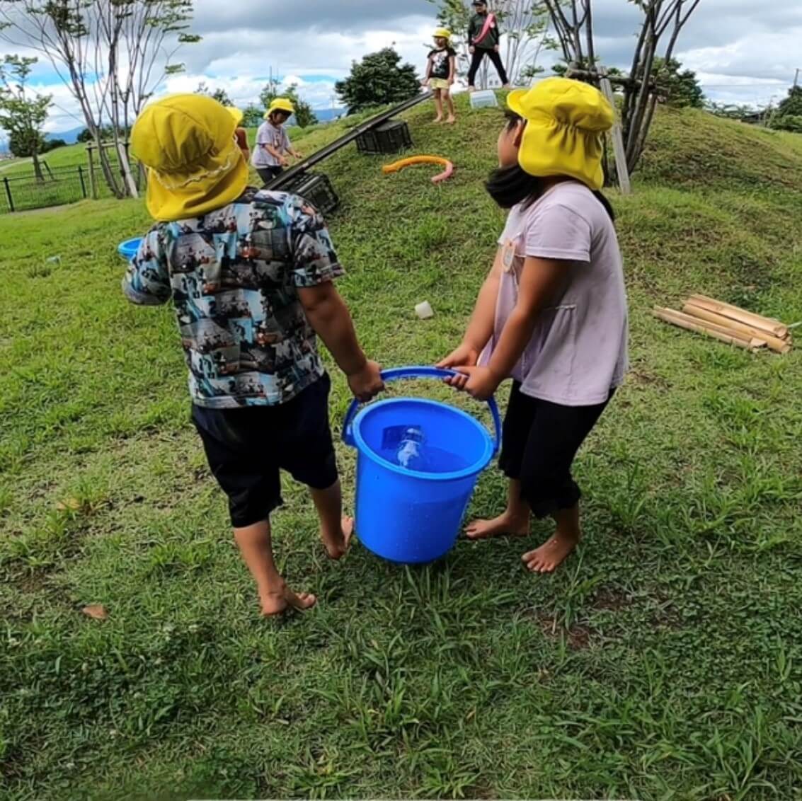 そんなある日のこと、男の子がバケツで水を汲み築山の上に持って行こうとしましたが、重くて一人では運べずに困っておりました。すると、その子が「誰か手伝って」と声にだすと「いいよ」と言って一人の女の子が運ぶのを手伝ってくれました。