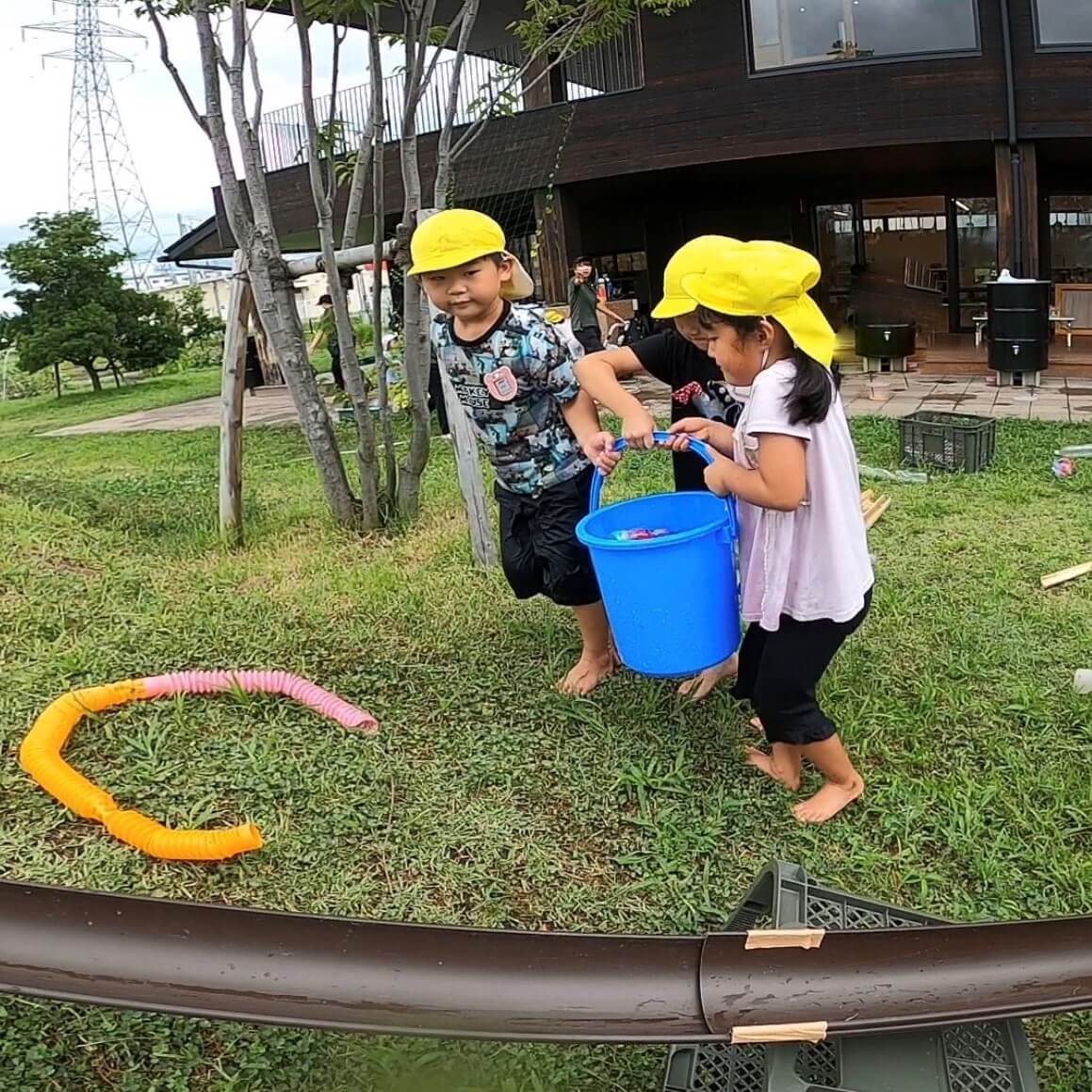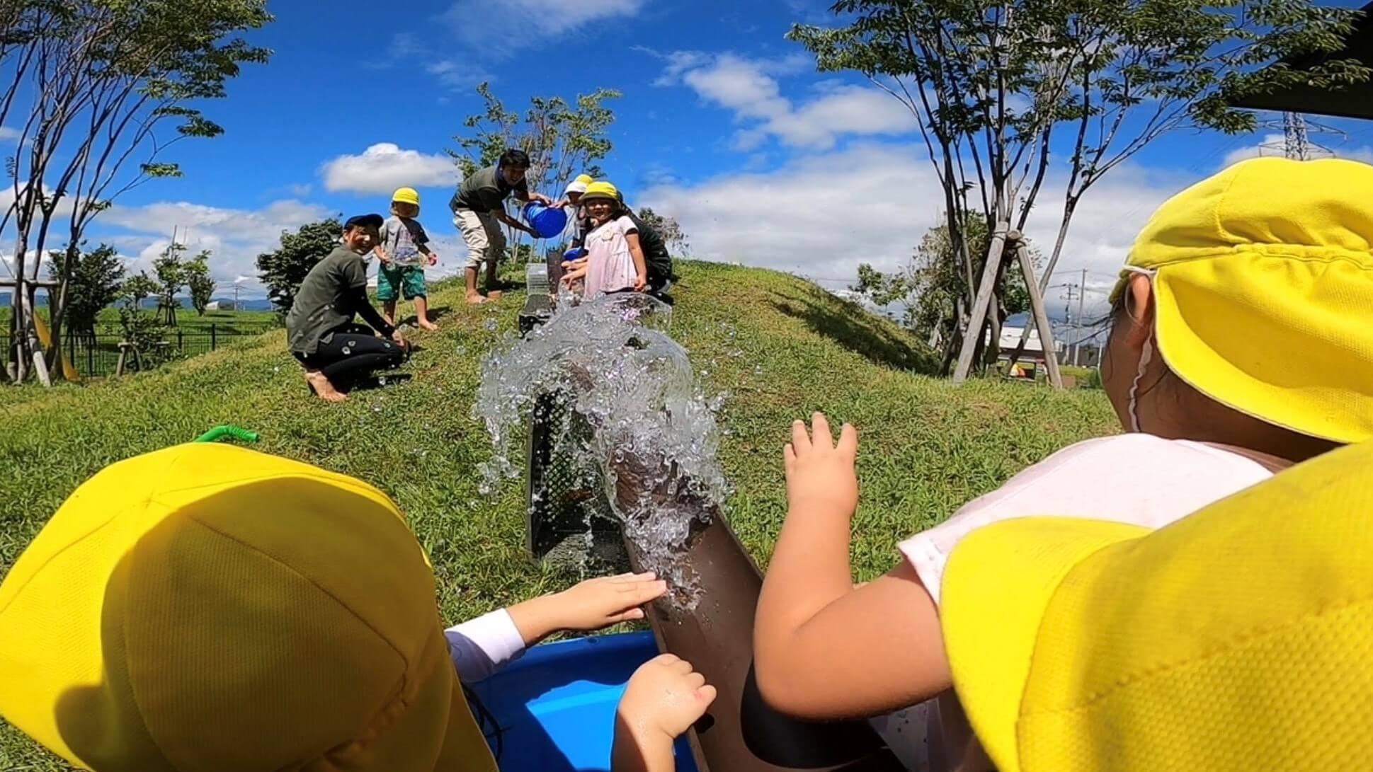 日々水遊びをしている中で、子どもたちの遊びも色々と展開されています。最初は各々の水遊びを楽しみ、好きな場所で好きなように水に触れていました。そこから徐々に築山の上からホースや竹を置いて水が流れる様子を楽しみ、雨どいを使って道を作ったり、ペットボトルの船を流してみたりと友達と「こうやってみようよ」「こっちじゃない?」などの試行錯誤をしながら水が流れるのを楽しんでいました。