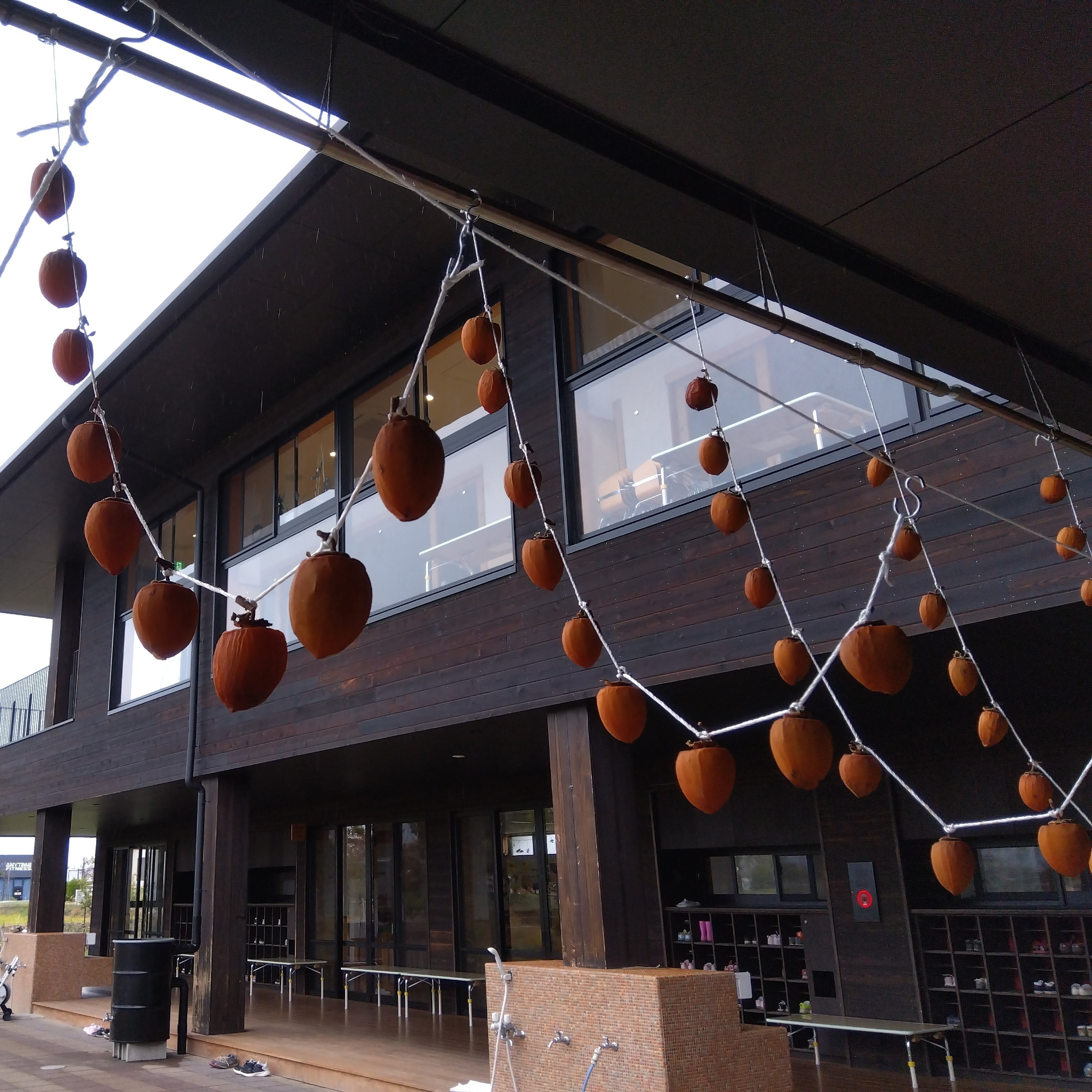 日に日に寒さが増し、木枯らしが吹く季節になってきました。縁側を歩く子どもたちは、「寒いね~」と言いながら顔を見合わせます。自然豊かな園庭がある八山田どろんこ保育園・発達支援つむぎ 八山田ルームでは、赤く紅葉したモミジが落葉したり、軒下には干し柿が干してあったりと秋から冬に移り変わる景色がみられます。