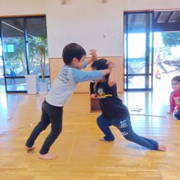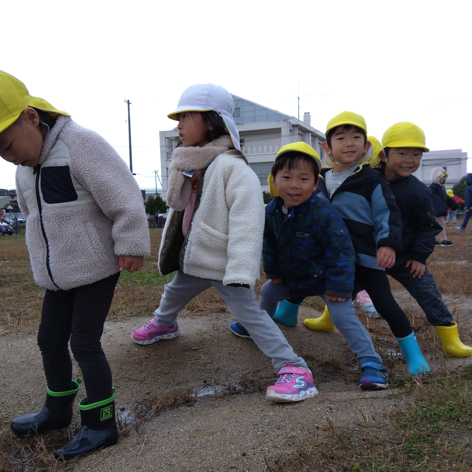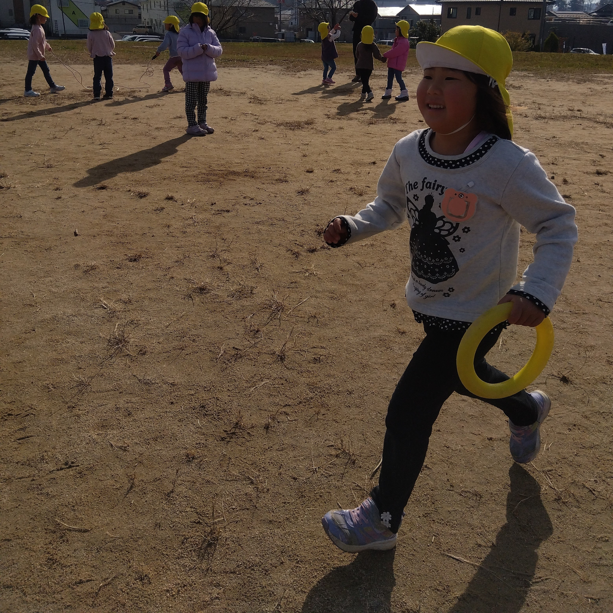 散歩に出る前は上着を着こんで出発しますが、街中をたくさん歩き広場についた時には体も温まり上着を次々に脱いで元気いっぱい走り回ります。広場には、滑り台やブランコのような遊具はありませんが、子どもたちは給食の時間まで目一杯自然の中で遊びます。最近は、ドッジボールやリレー、鬼ごっこ等、ルールのある遊びを楽しむ姿が多くみられるようになりました。
