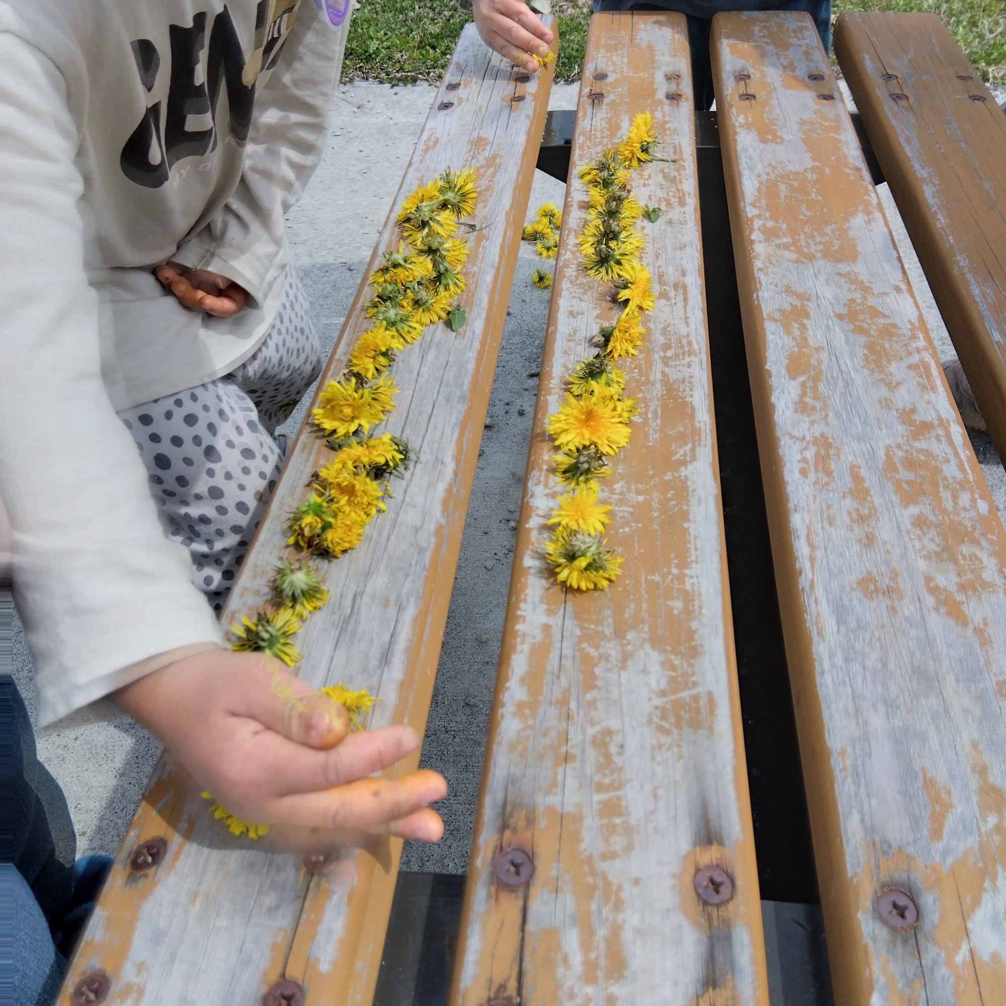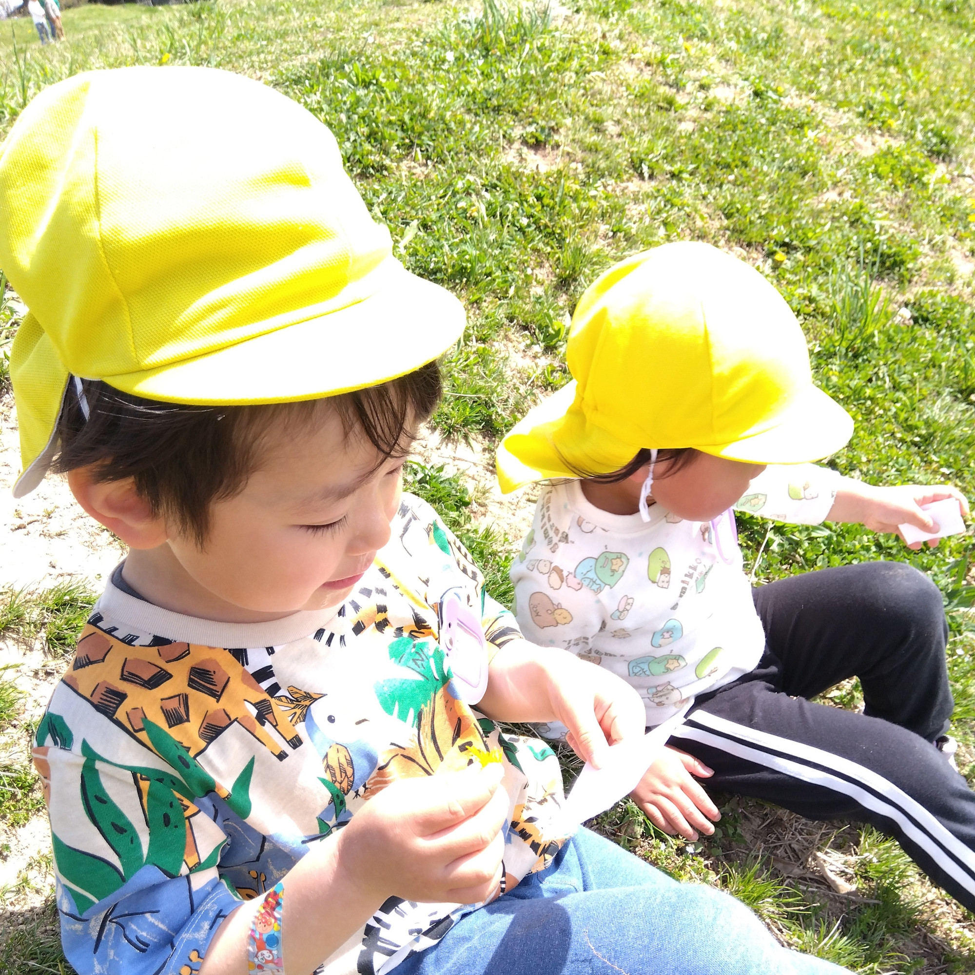 3歳児の子どもたちはたんぽぽ摘みに夢中です。そんな中、たんぽぽで手が黄色になったことに気付いた子が、「こっちの花は青だよ」「赤くなる花もあるかな」と様々な草花を探し始めました。