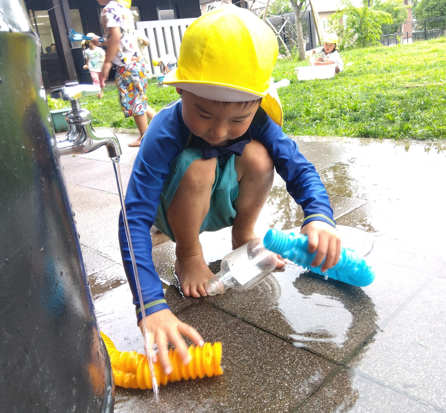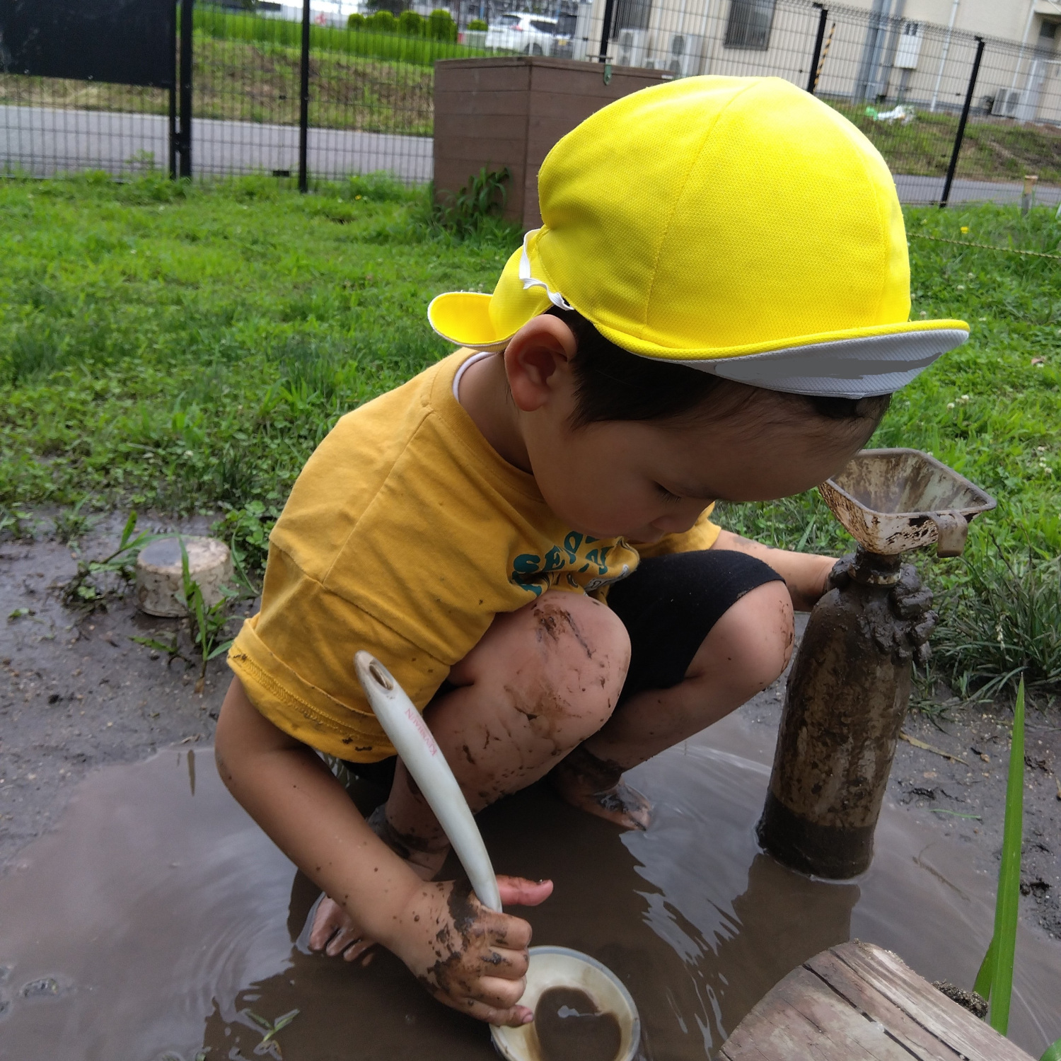 水が流れていく様子が楽しい子、水の流れに乗せて様々な物を流すことが楽しい子、砂の混ざり方を楽しむ子、泥水を食べ物に見立ててままごとをする子など遊び方は様々です。