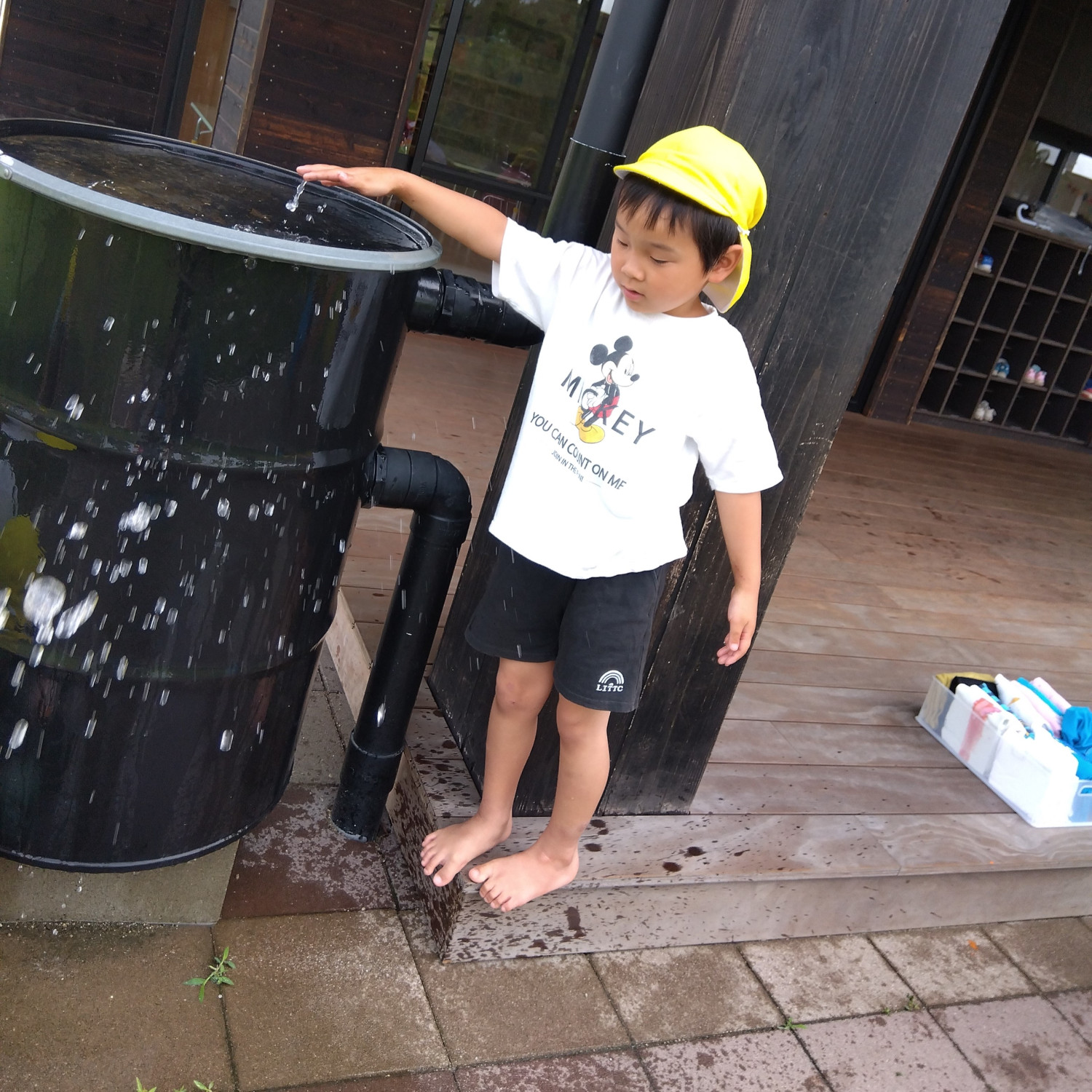 水しぶきの形が丸いことに気が付いた子が手で水を弾きながら「見て。丸いよ」と話します。その様子を見ていた子が水しぶきを見て「バシャってやってる」と笑顔で話しました。同じ光景を見ていても感じ方や表現の仕方が違っていて面白いです。