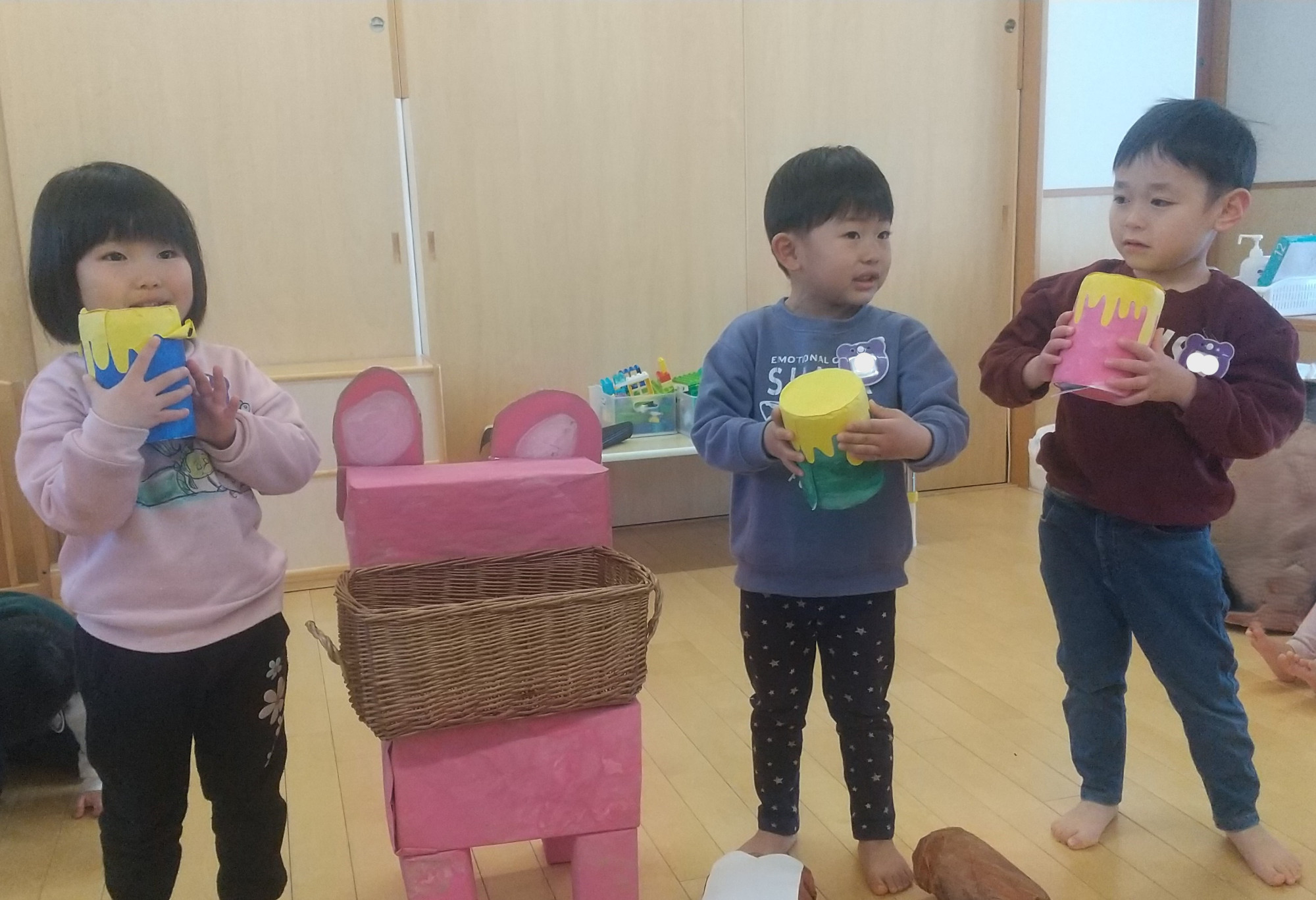 だいず組(3歳児)は「どうぞのいす」という演題で劇をやります。歌、セリフ、動きなど様々な事を周りの様子を見て頑張る姿が見られました。時には自身の入る場所がわからなくなったり、次の動きがわからなくなったりすることもありましたが、スタッフの支援もあり、自分なりの表現を楽しむ姿が見られました。その中で、隣のお友だちが手を繋いで誘導したり、優しく教えてくれたりと助け合う姿も見られ、保育園、つむぎ関係なく当たり前に手を取り合うことの大切さを教えてくれたようでした。