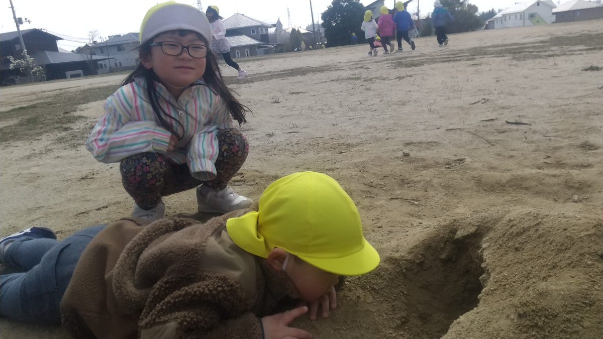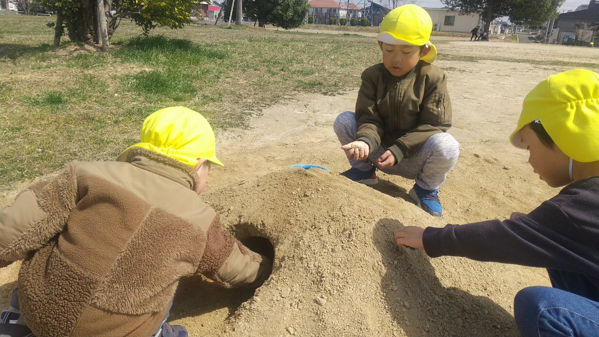 日中活動はいつものように広場に出かけます。こめ組(5歳児)の子が砂で山を作っていると、3歳のつむぎの子が少し距離を置いて眺めたり、遠慮がちにつついたりなどして様子を伺っています。それを見て「一緒にやる?」と5歳の子が声をかけてくれました。声をかけられて安心したのか、その子に近づいていき、一緒に山を作ったり、穴を掘ったりなどして楽しんでいました。