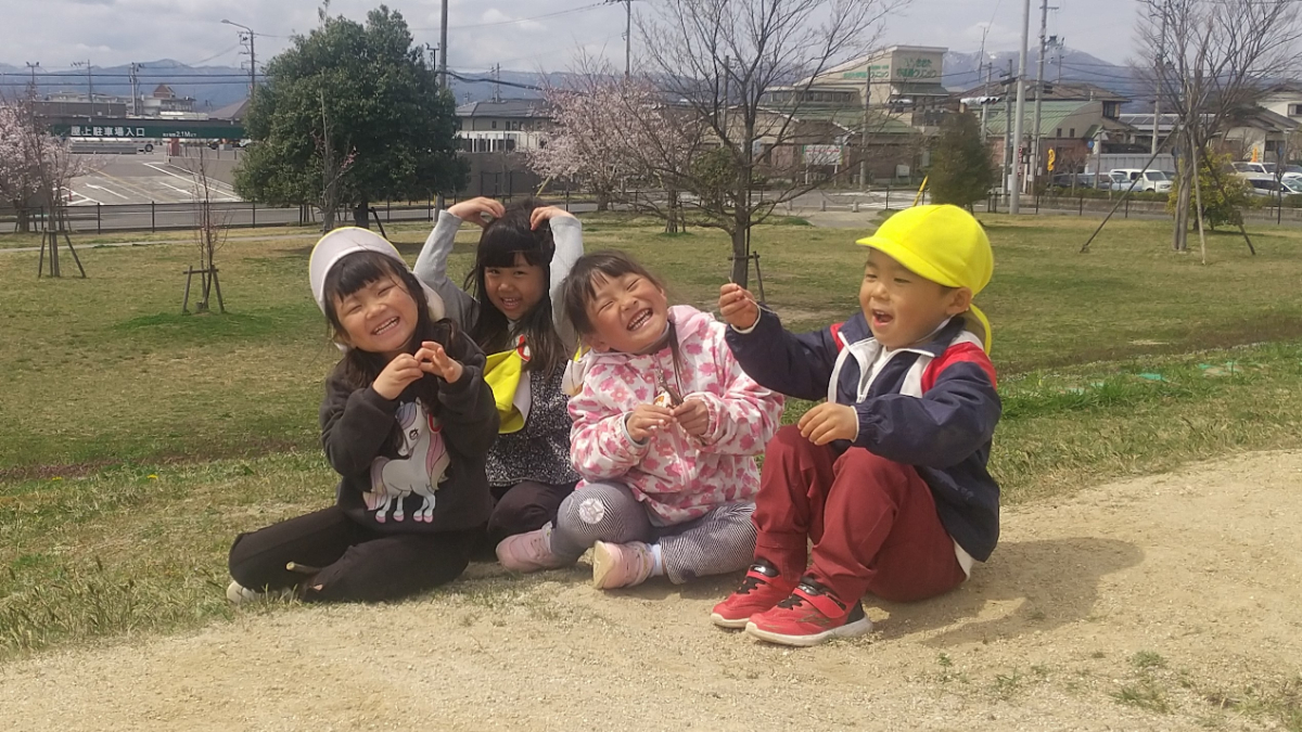 また別の場所ではこめ組(5歳児)の子たちが青空の下日向ぼっこをしています。その傍ら、つむぎ(4歳児)の子が植物を拾って一人で遊んでいると「〇〇くんもどうぞ!」と日向ぼっこに誘ってくれました。誘われたことがよほど嬉しかったのか飛び跳ねながら隣まで行く姿があり、こめ組の子たちが歌を歌うと一緒に座ってその雰囲気を楽しんでおりとても微笑ましい瞬間でした。