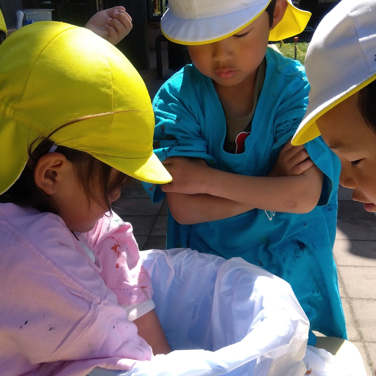 「こっち側だけじゃなくて裏にもつけたらどうなるのかな?」と布地の両面を輪ゴムで縛る子や「プリンセスの髪の毛みたい!」と布を細長くして縛る子、「両方やりたい!」と輪ゴムで縛り反対側を割り箸で挟む子など、一人ひとり自分のイメージに合わせ、それぞれ思いのままに作り上げていきます。
