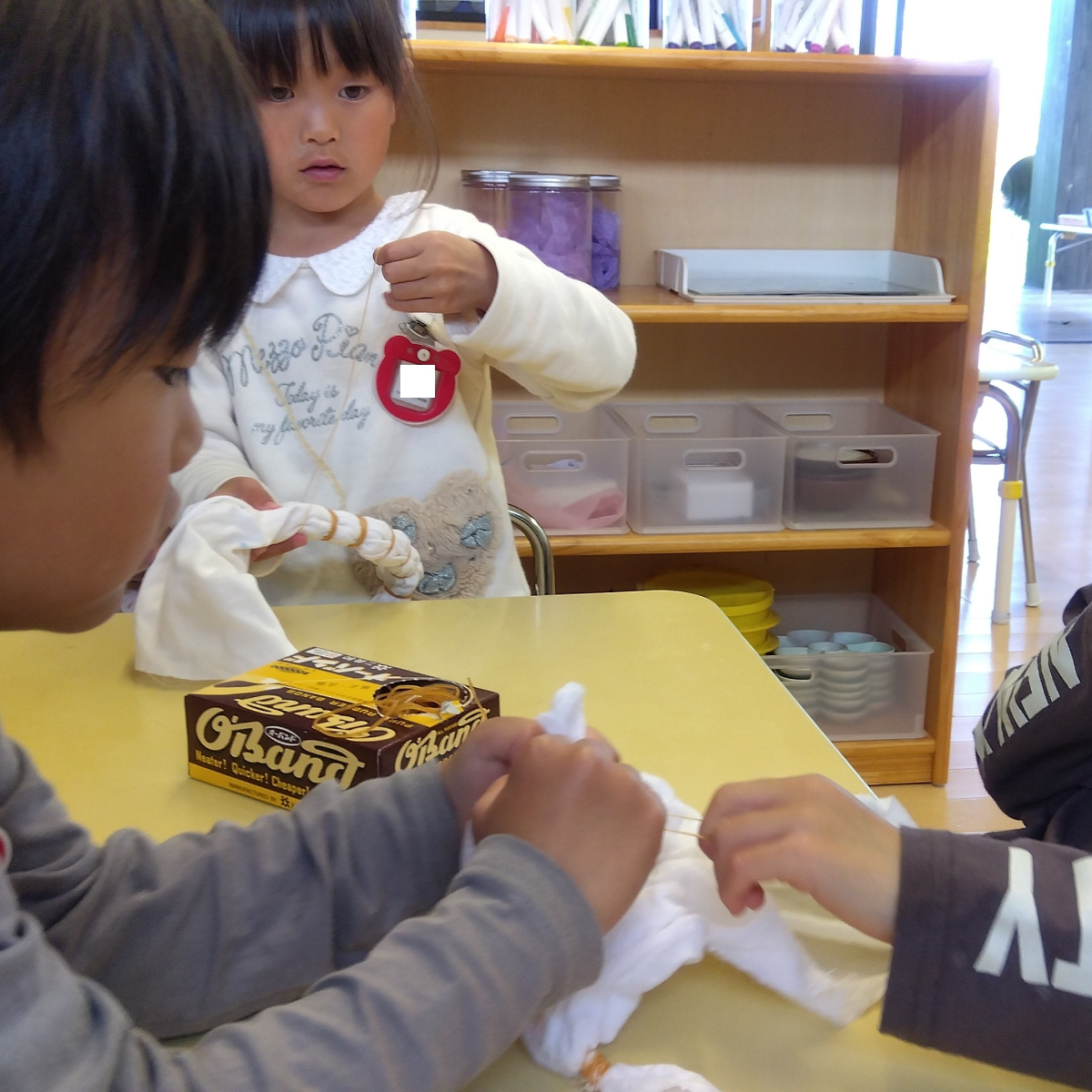 中には、やりたいけど上手く縛れない子もいます。「もうこれで終わりたい」1人で出来ず途中で諦めようとする言葉もあります。そんな時は「先生と一緒にやってみない?」スタッフが声をかけ、やり始めるとだんだんとコツを掴み始めて、「1人でやってみる」と時間をかけながらゆっくり自分のペースでやりきることができました。