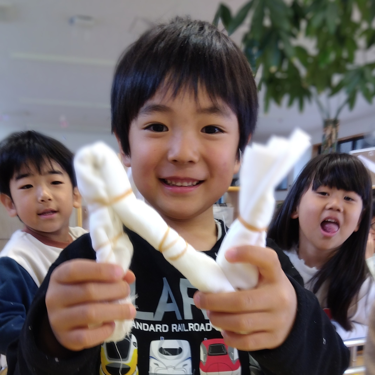 「見て!できた!」と、その表情は嬉しさと自信に満ち溢れたものでした。また、出来なくて困っている子に対しては「どうやりたいの?」「ここでいいの?」と自分から声をかけ手伝いする子や「見てごらん」とゆっくり縛る動作を見せて説明しようとする子など、困っている子に寄り添い手を差し伸べている子どもたちの姿がありました。